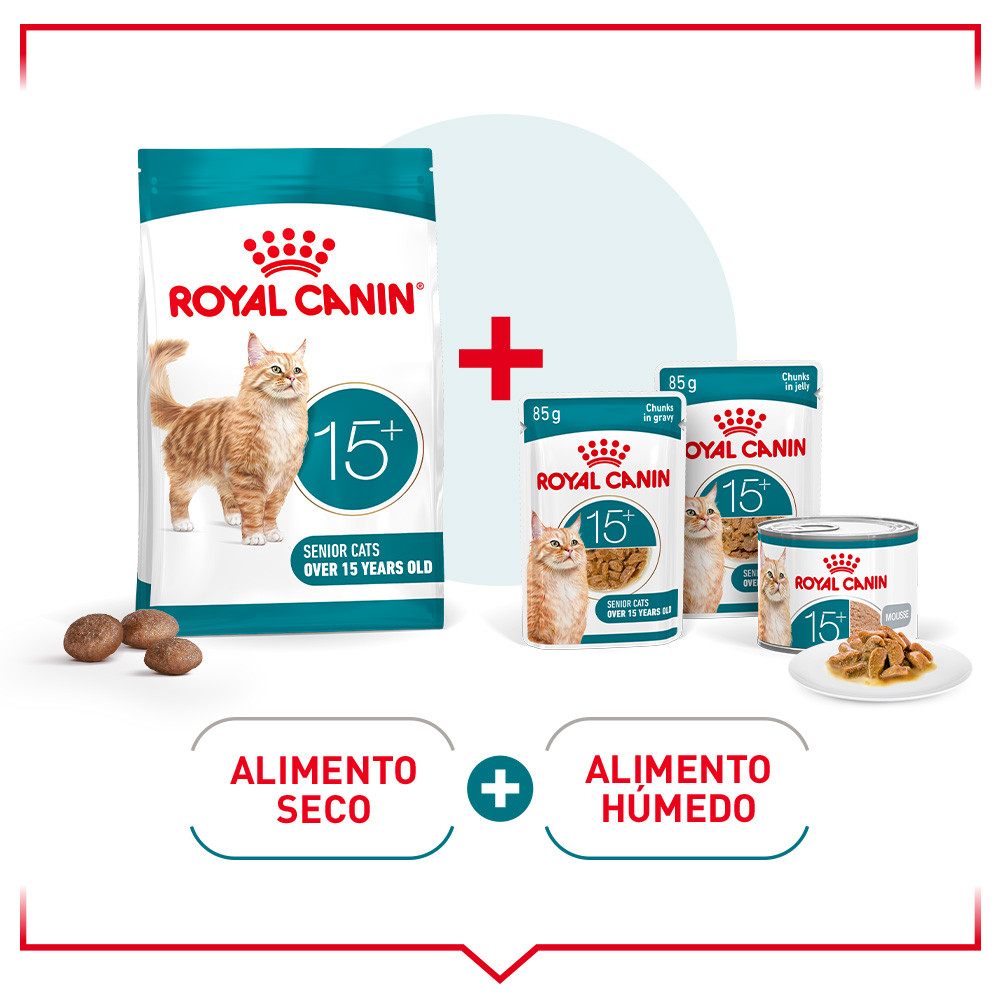 Royal Canin 15 pienso para gato senior es un alimento completo y equilibrado, formulado para gatos de edad avanzada a partir de los 15 años. Sus croquetas están diseñadas con una textura especial que facilita la masticación, probadas directamente en gatos mayores para asegurar su aceptación.