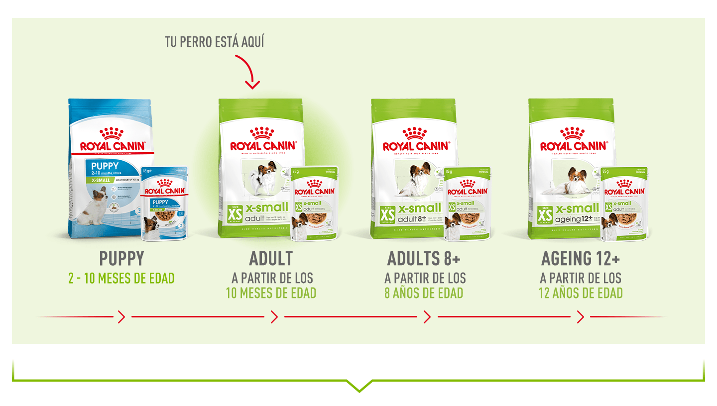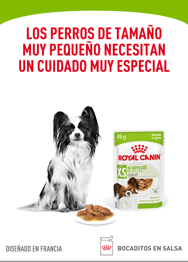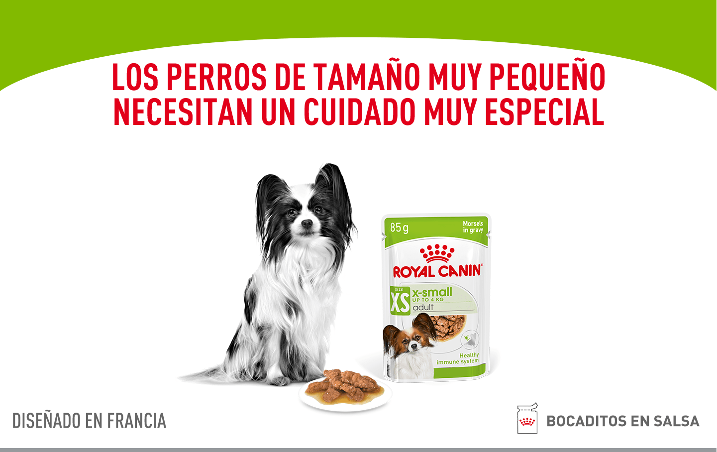 Royal Canin X-Small Adult trozos con salsa es un alimento húmedo nutricionalmente completo y equilibrado, especialmente formulado para satisfacer las necesidades específicas de los perros de razas muy pequeñas y ayudarles a lo largo de su vida adulta. Está destinado a perros de hasta 4 kg de peso y más de 10 meses de edad.