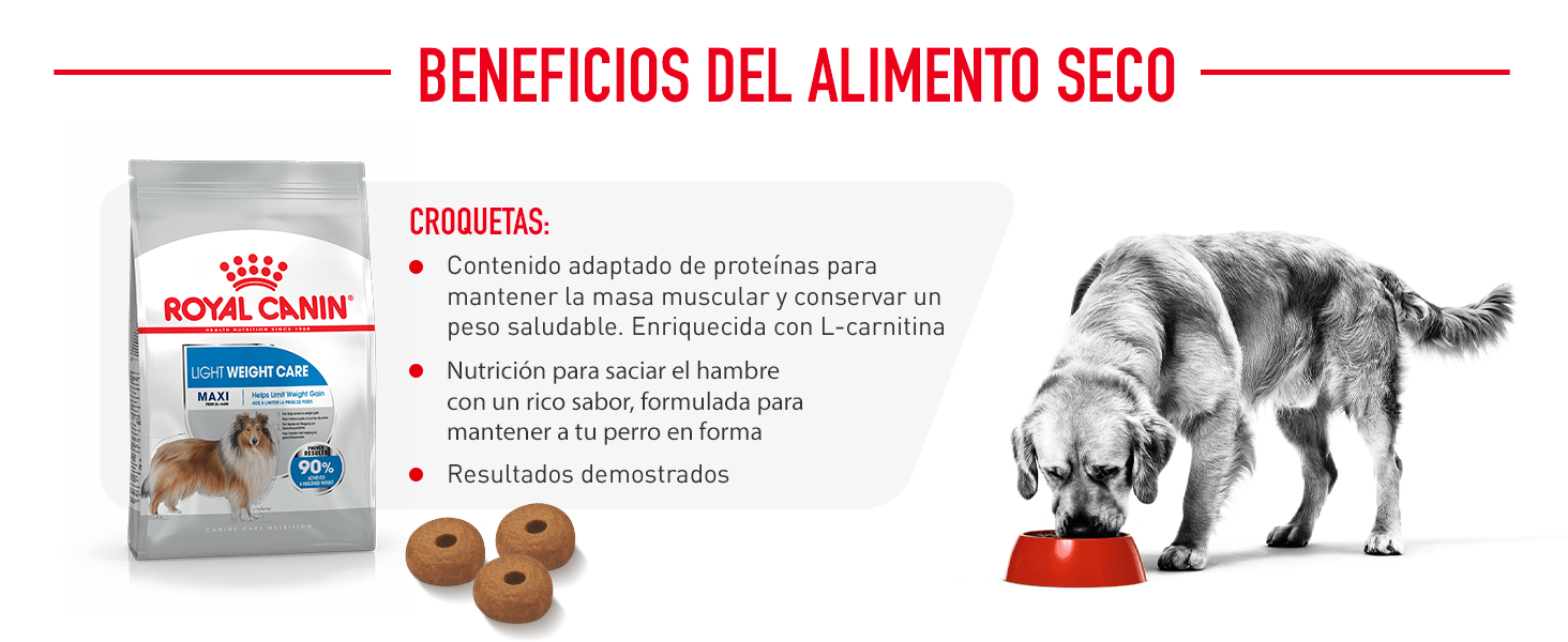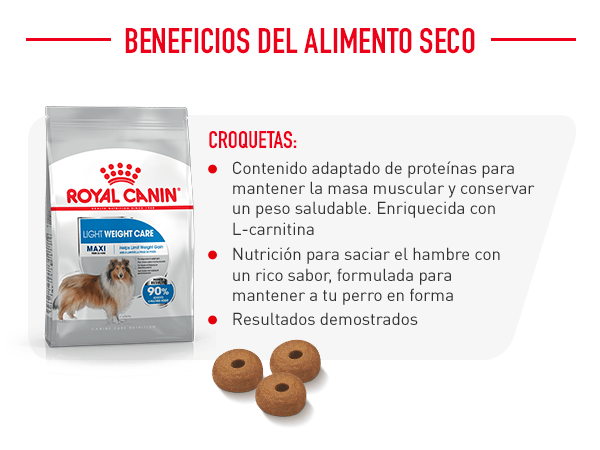 El pienso para perros Royal Canin Light Weight Care Maxi es un alimento dietético elaborado para dar respuesta a los requerimientos nutricionales de adultos de razas grandes (de 26 a 44 kg) con problemas de obesidad o tendencia a engordar.