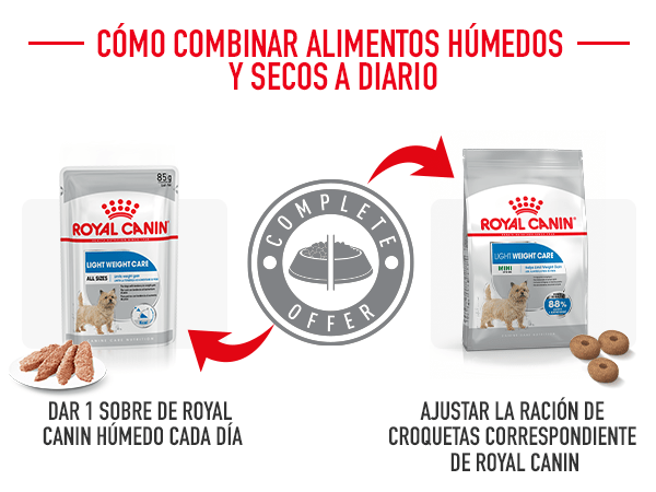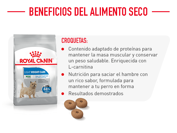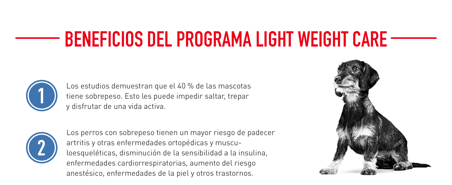 El sobrepeso es un problema de salud que afecta a muchos perros y puede causar problemas articulares entre otras complicaciones veterinarias. El pienso Light Weigth Care mini de Royal Canin te ayuda a mantener a tu perro en su peso ideal. Gracias a su elevado aporte protéico pero bajo aporte graso y a la acción quemagrasas de la L-carnitina, Royal Canin Mini Light ayuda a mantener y reducir el peso de tu perro, manteniendo los niveles de masa muscular de forma apropiada. Sensación de saciedad provocada por las fibras que retrasan la sensación de hambre entrre comidas.
