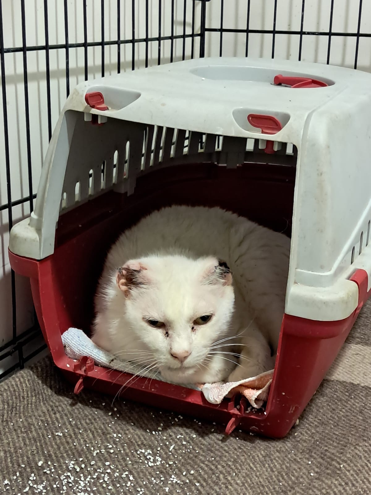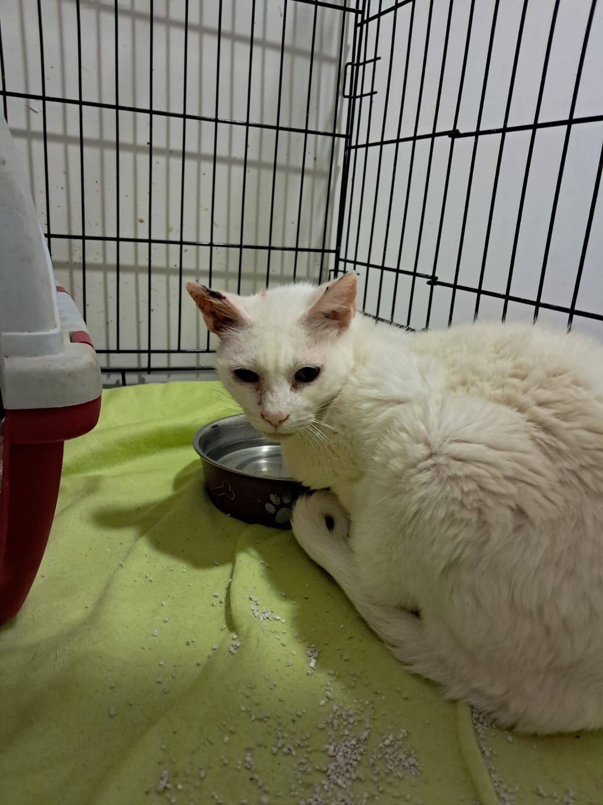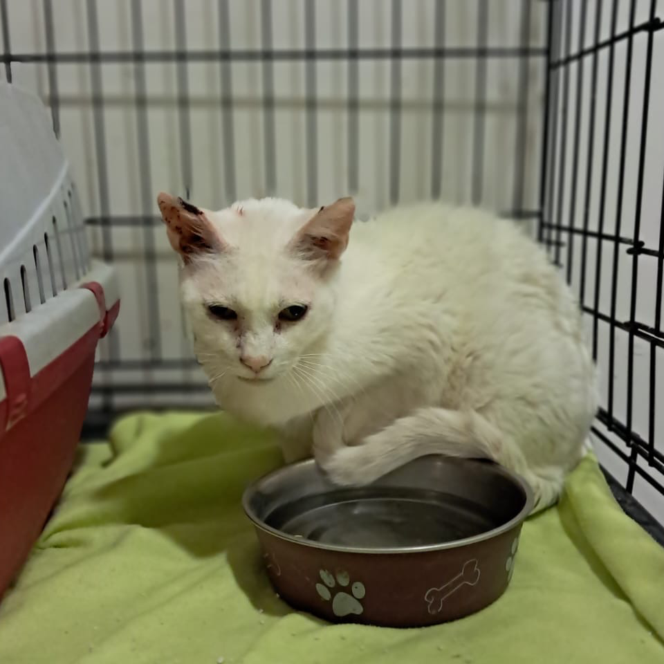 Su historia no es fácil. Simplón como casi todos los gatos blancos tuvo carcinoma en las orejitas , aunque ya está curado, pero que no le quita las ganas de vivir ni de disfrutar del calor de un regazo. A pesar de todo, sigue siendo ese compañero tranquilo que se acomoda a tu lado y te recuerda, con un ronroneo suave, que el tiempo compartido es el mejor regalo. Simplón es negativo en leucemia e inmunodeficiencia.. Simplón no pide mucho: un hogar donde sentirse seguro, acompañado y querido. Puede ser en acogida permanente o en adopción, lo importante es que tenga a alguien que le dé la oportunidad de vivir sus días rodeado de cariño, sin fríos barrotes ni soledad.