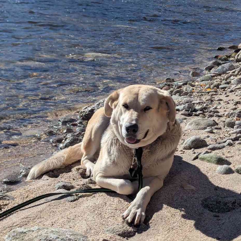 Es una perra tranquila y algo miedosa pero lista para encontrar un hogar.