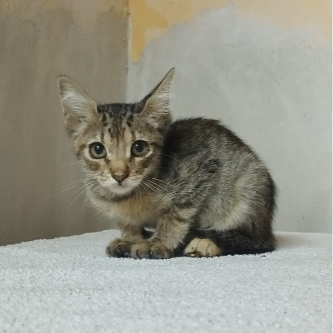 Esta peque ha sido recogida de la calle en muy mal estado, llegó muy delgada y débil. Despúes de unas semanas de cuidados y mimos ya está mucho mejor, está cogiendo peso y cada vez está más animada. Es una gatita muy buena, un poco tímida al principio pero nunca nos ha hecho un mal gesto. En cuanto la acaricias se pone a ronronear. Está recuperándose de vivir en la calle y preparada para tener un hogar.