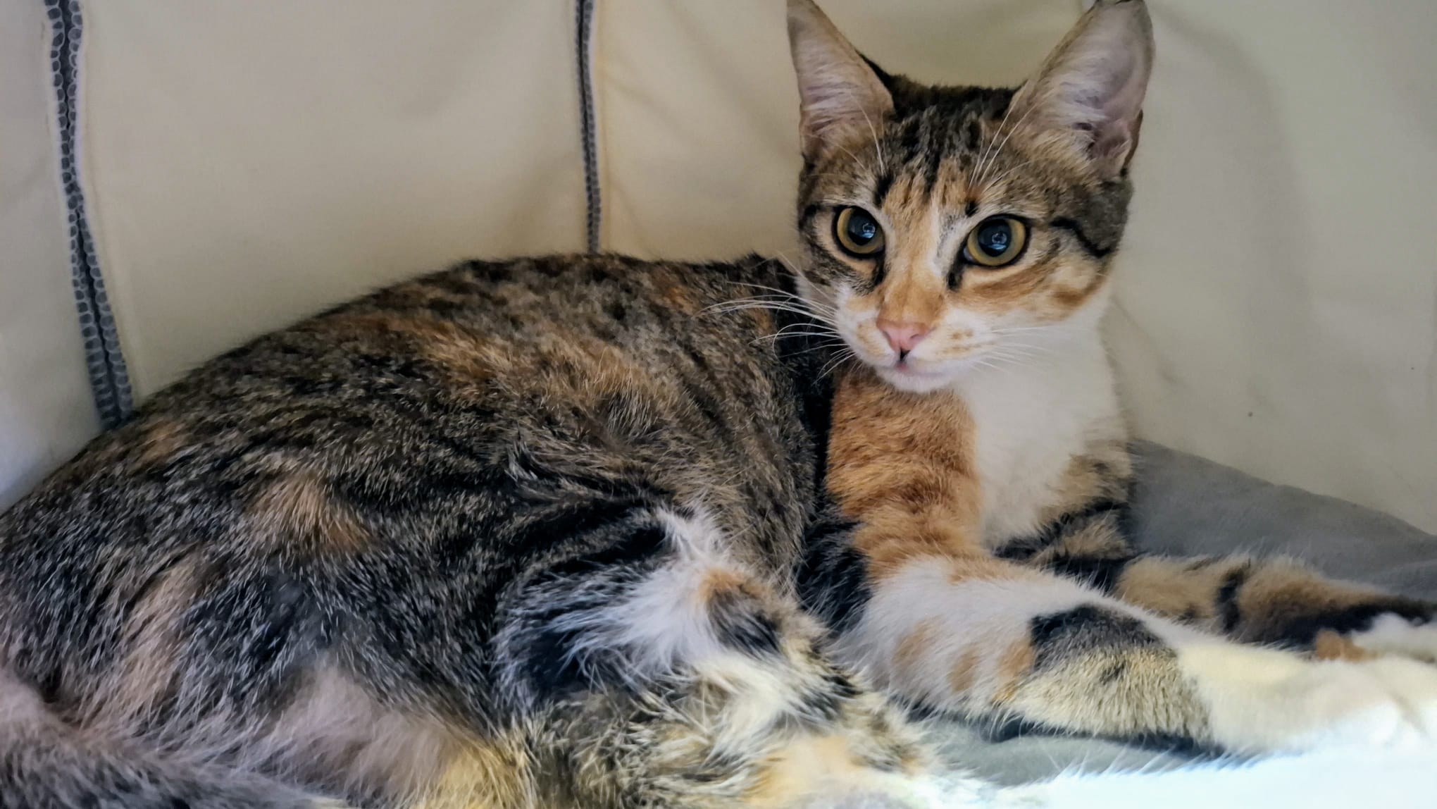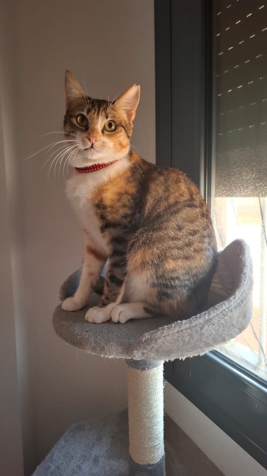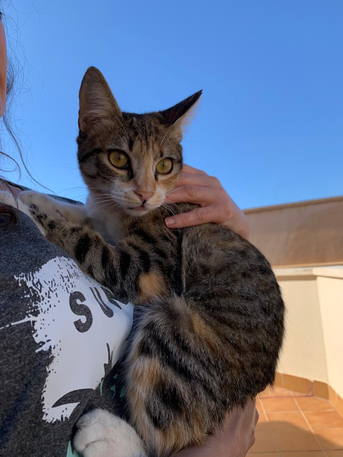 Minerva es una preciosa gatita tricolor de aproximadamente un año. Es de tamaño pequeño (apenas pesa cuatro kilos). Es extremadamente cariñosa y mimosa, muy juguetona y activa, le encanta saltar por los muebles, esconderse en cualquier hueco y explorar. No es nada tímida ni miedosa y se acerca a las personas a buscar mimos aun sin conocerlas. Convive muy bien con un perrito pequeño y tranquilo y es buenísima con niños, con gatos habría que hacer una introducción y presentación correspondiente. Está testada y esterilizada y en breve también vacunada. Para su adopción es IMPRESCINDIBLE tener protecciones en ventanas y terraza