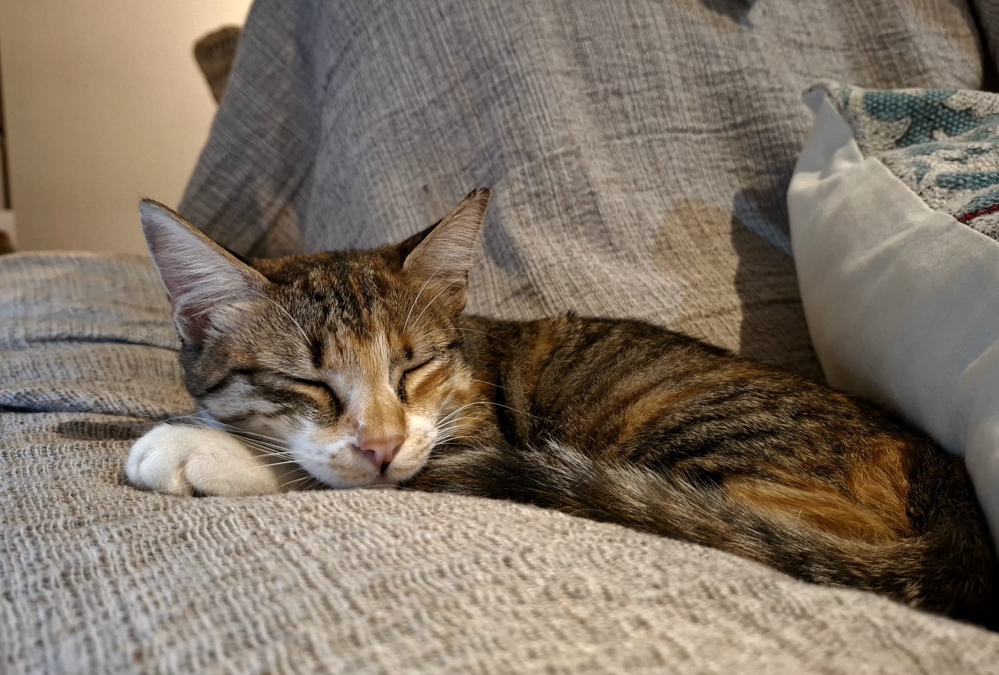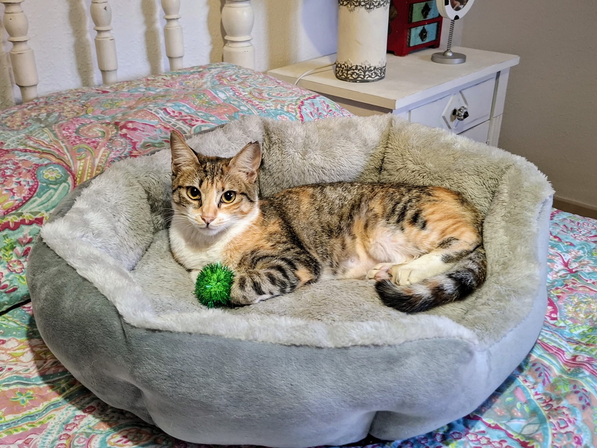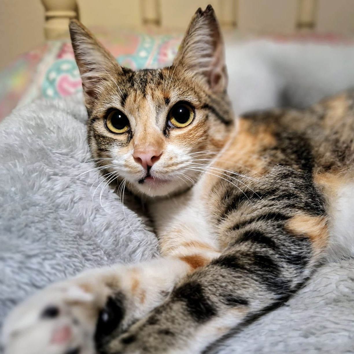Minerva es una preciosa gatita tricolor de aproximadamente un año. Es de tamaño pequeño (apenas pesa cuatro kilos). Es extremadamente cariñosa y mimosa, muy juguetona y activa, le encanta saltar por los muebles, esconderse en cualquier hueco y explorar. No es nada tímida ni miedosa y se acerca a las personas a buscar mimos aun sin conocerlas. Convive muy bien con un perrito pequeño y tranquilo y es buenísima con niños, con gatos habría que hacer una introducción y presentación correspondiente. Está testada y esterilizada y en breve también vacunada. Para su adopción es IMPRESCINDIBLE tener protecciones en ventanas y terraza