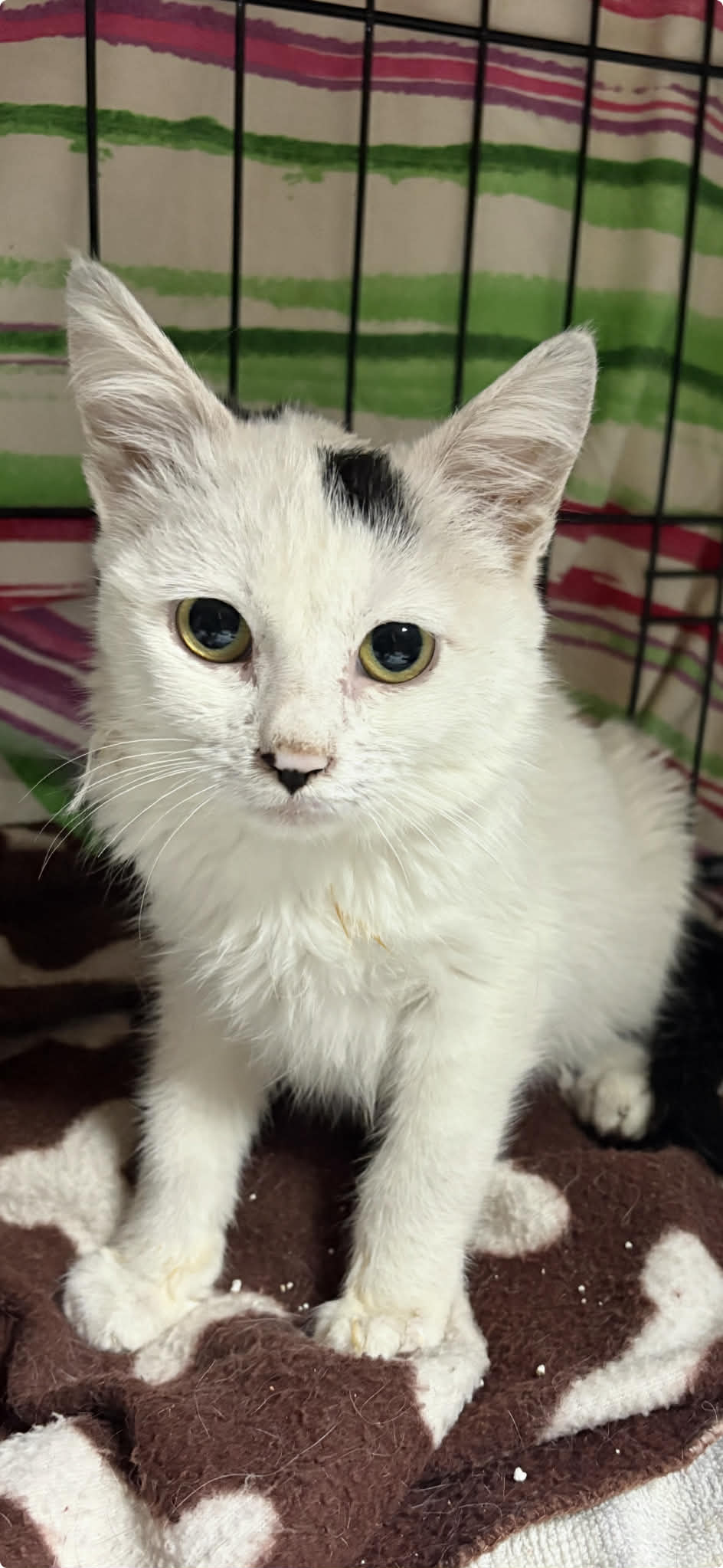 Al principio es tímido ya que viene de un lugar donde desconfiar es su salvación, luego es un amorcito, le gusta y necesita estar con otro gato