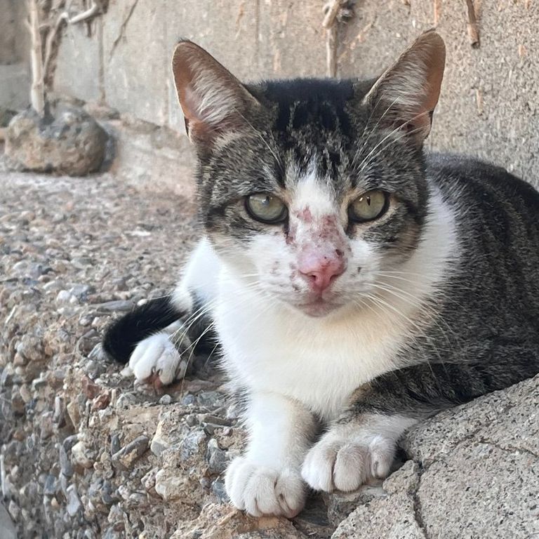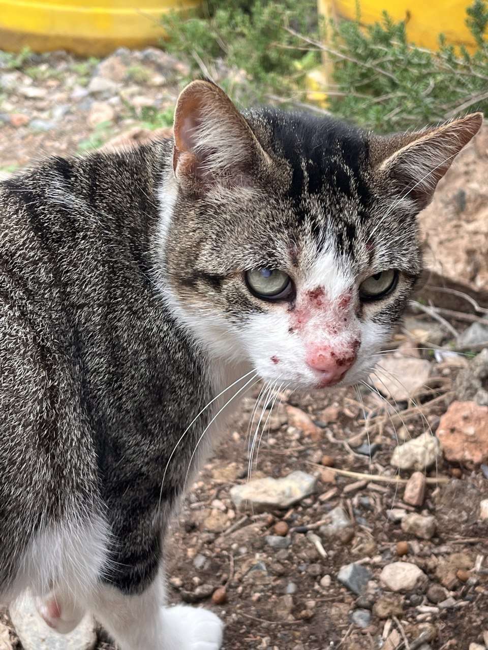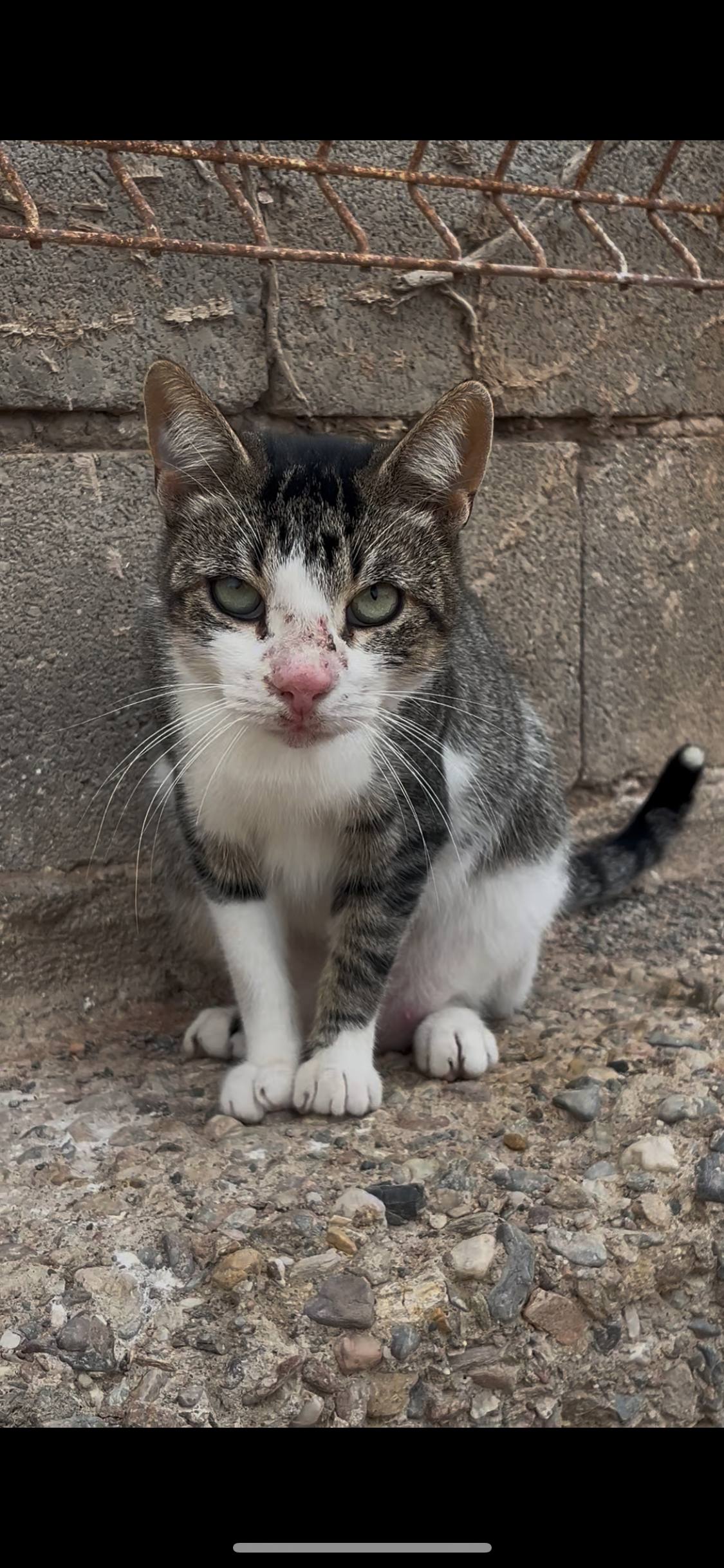 Es un gato sociable al principio un poco timido. Sigue en la colonia pero necesita salir de ahi y estar en una casa calentito y sin que lo ataquen los otros gatos (de ahi sus heridas)