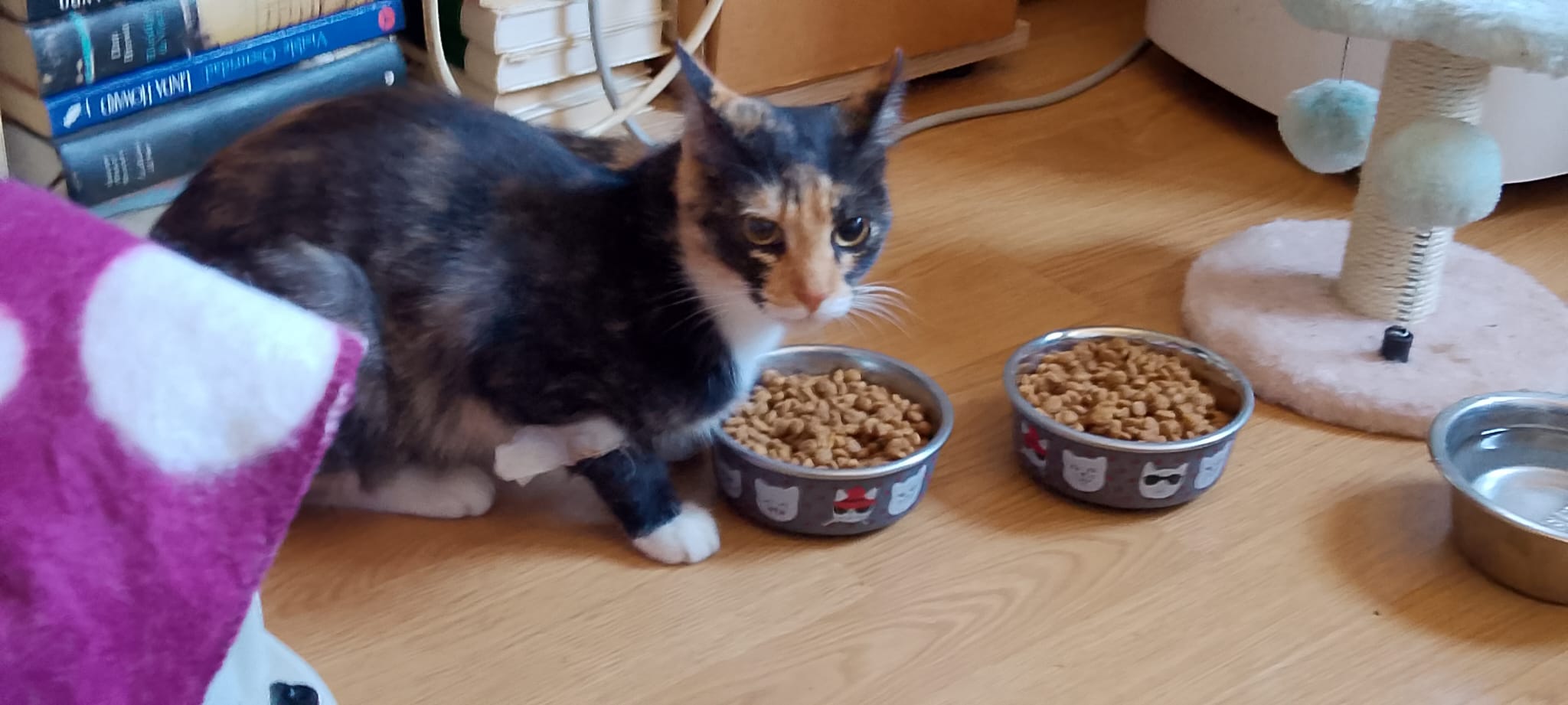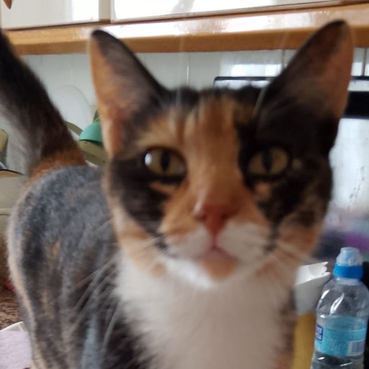 Pongui es una gatita tricolor superamorosa y mimosa. Le gusta pasear al aire libre, pero siempre cerca de su tutor. Si tienes un lugar con terraza o balcón protegido, Pongui es una compañera ideal.