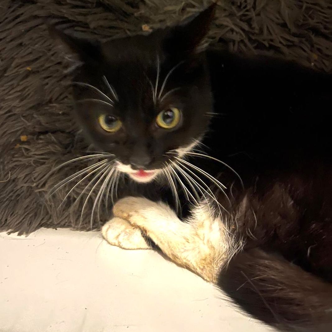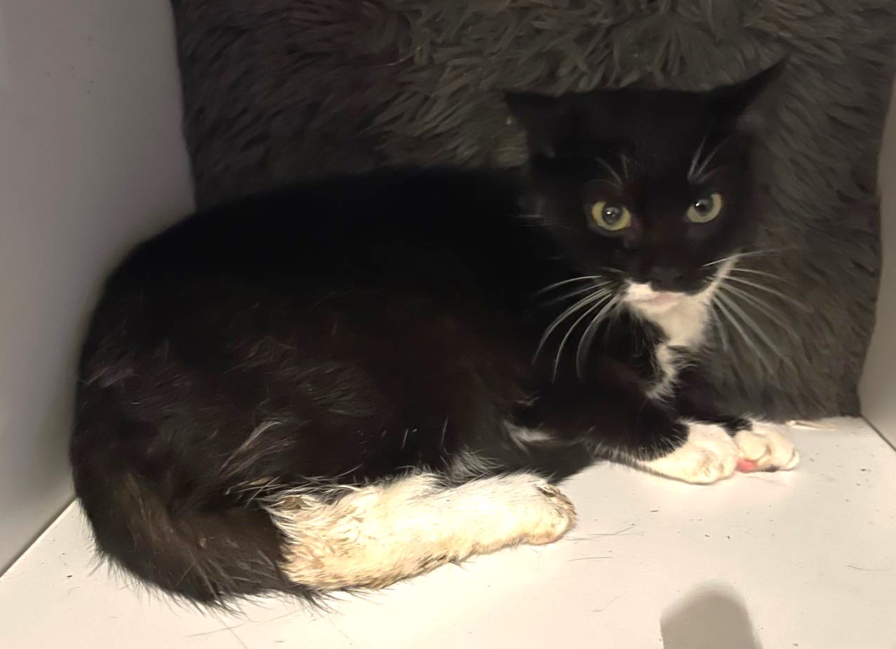 Batfing fue rescatado en una casa en ruinas, famélico y deshidratado. Lleno de pulgas, sus expectativas de supervivencia eran escasas. Una vez desparasitado y en una casa de acogida, es un gatito muy agradecido, aun muy comilón por el hambre que pasó pero con muchas ganas de recibir mimos y juegos.