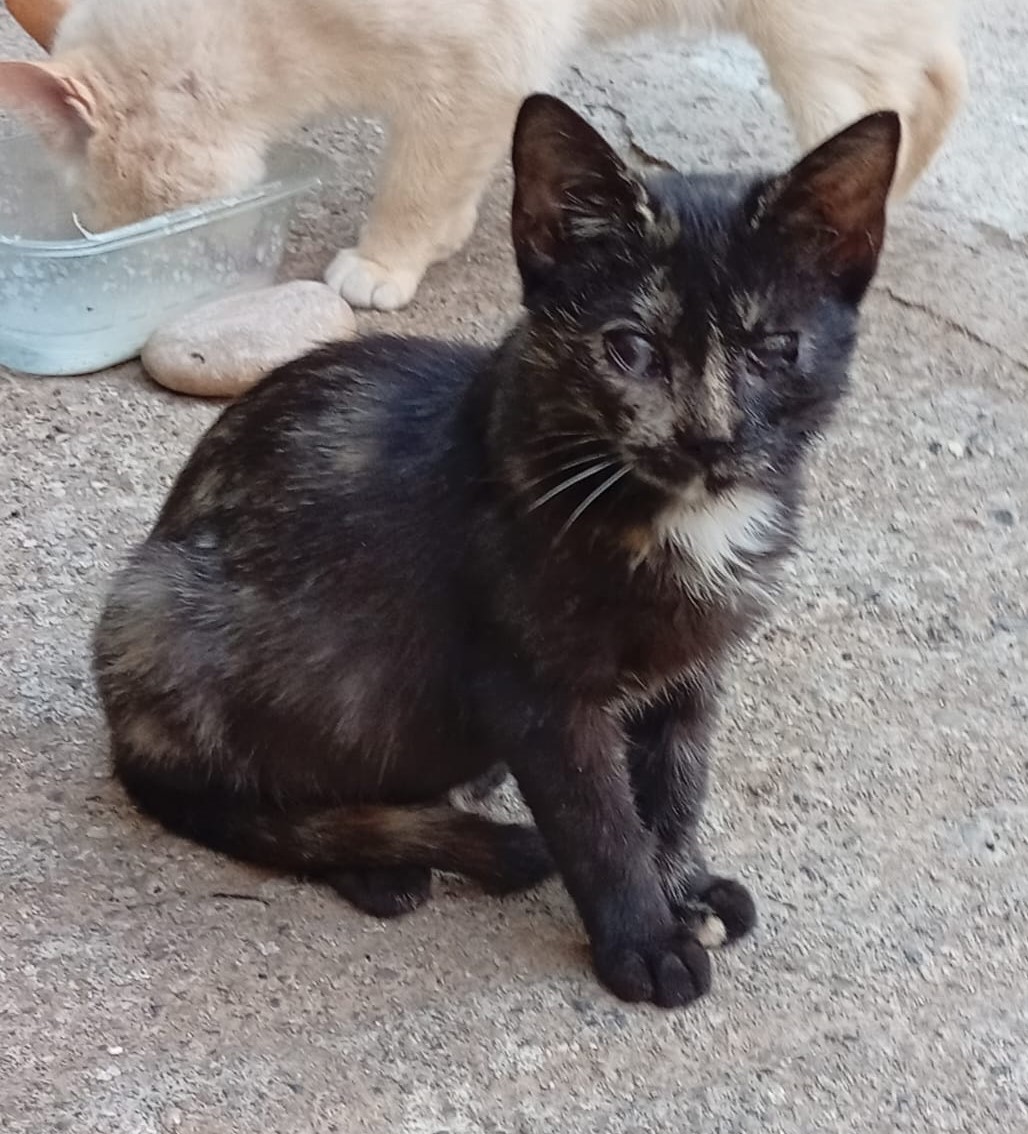 Gatita de 4 meses, carey, casi ciega y desprotegida en la calle, donde no puede sobrevivir. Necesita un hogar cariñoso y paciente