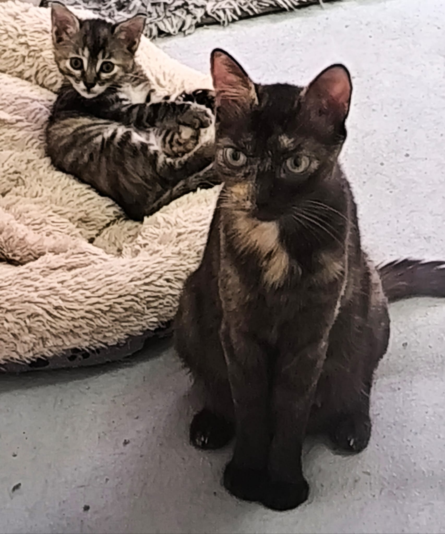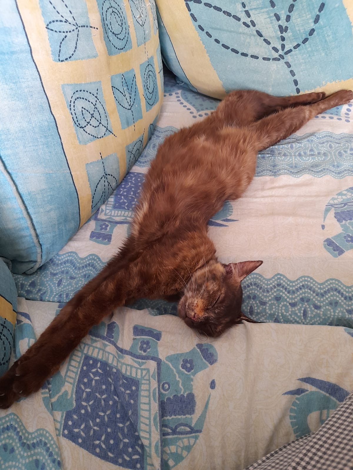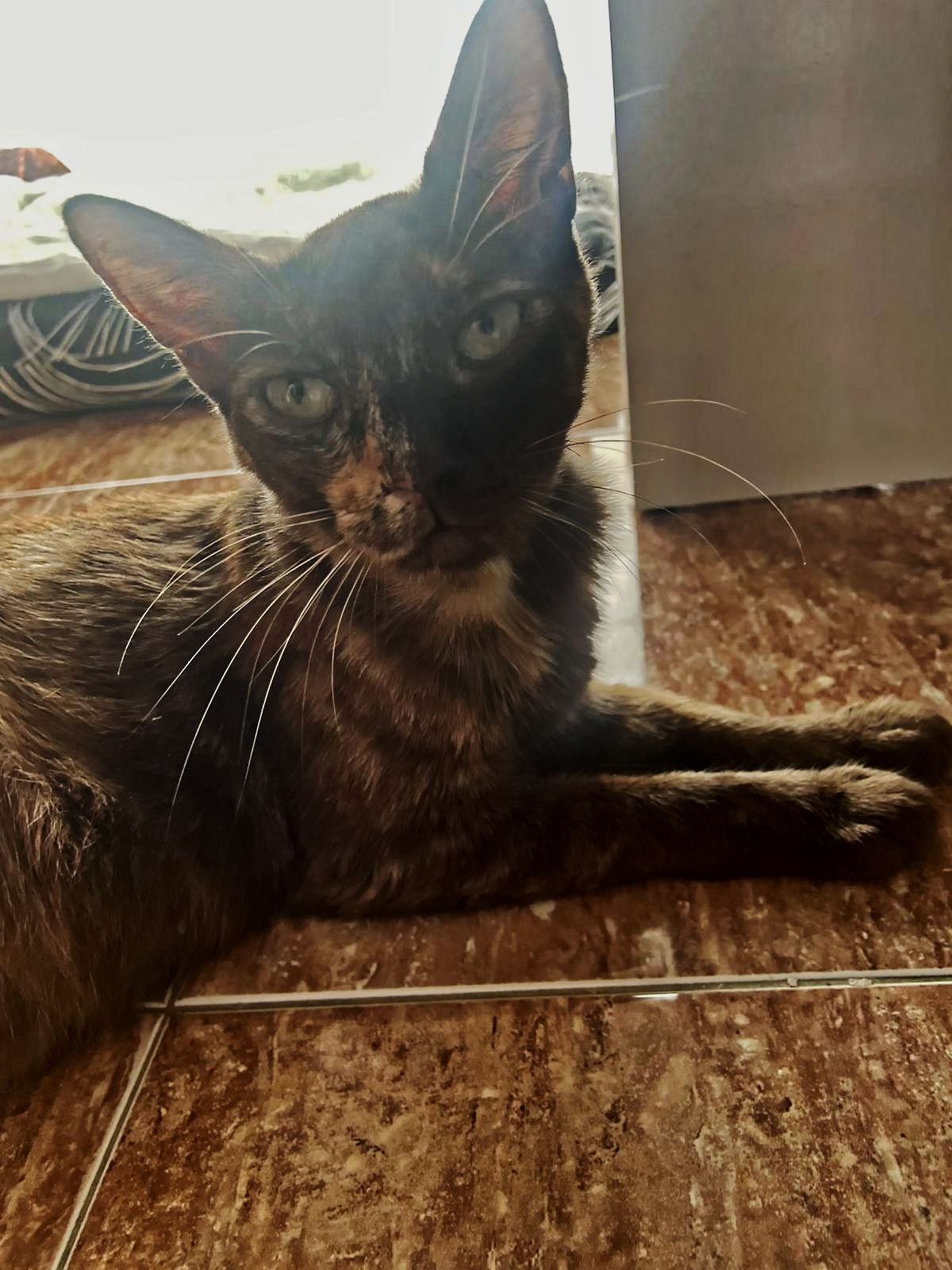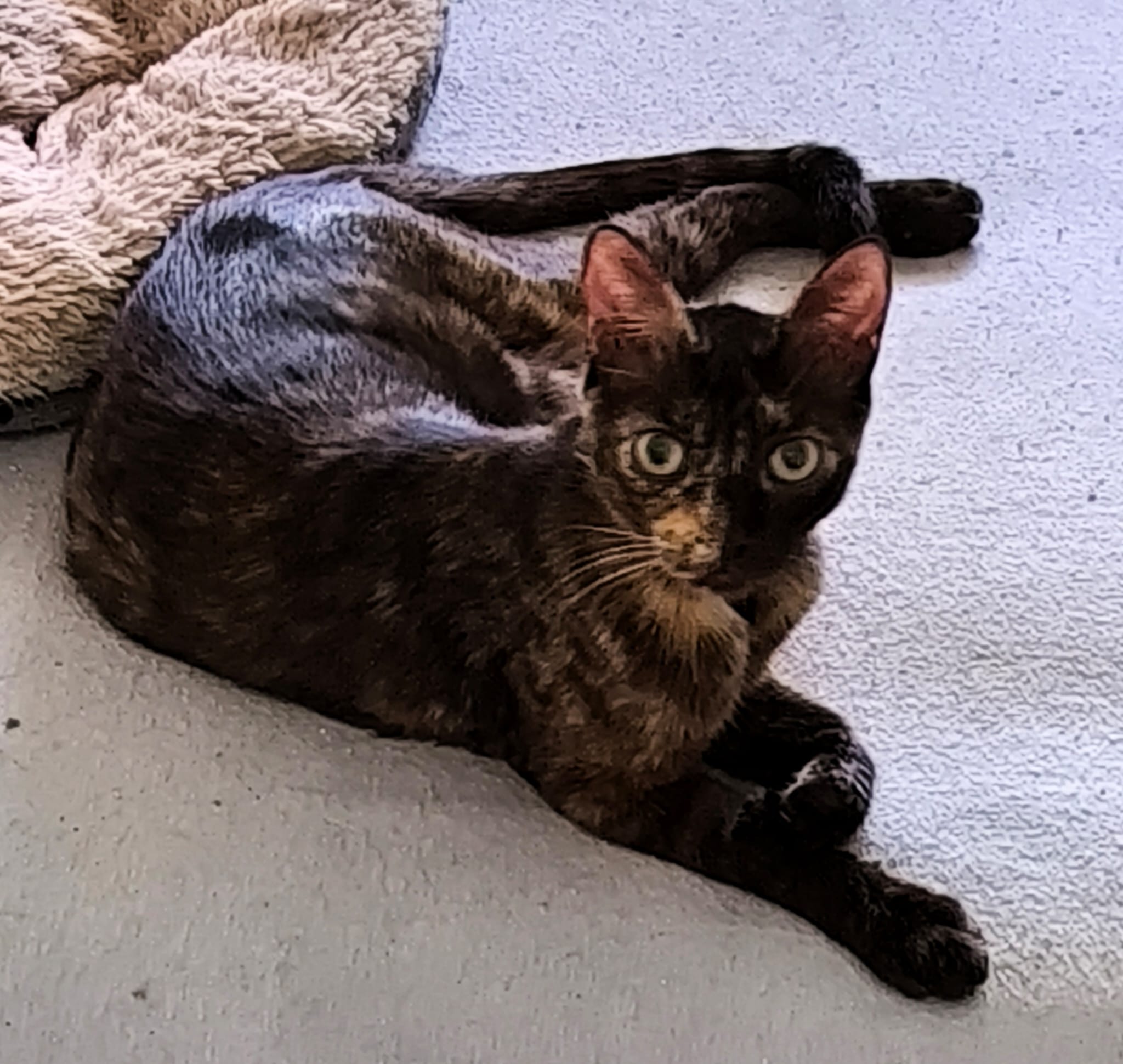 Es una gatita jovencita, recogida de la calle en un estado de gestación muy avanzado. Parió a sus bebés en una casa de acogida. Ella es muy buena y cariñosa,seguramente se trate de un abandono 😔
