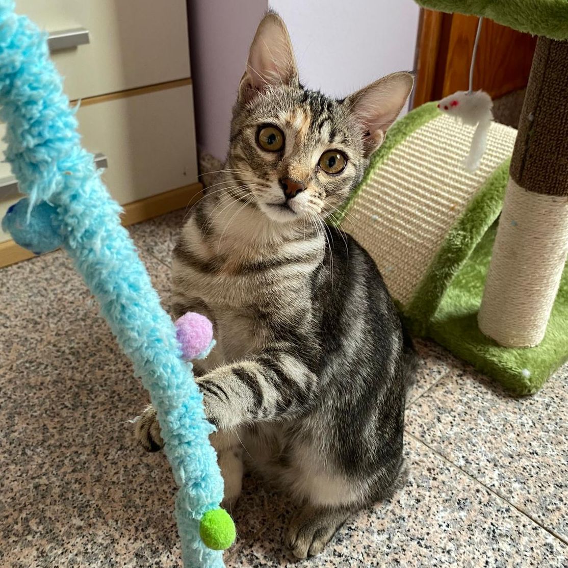 Zoe es una gatita gris atigrada con un carácter dulce y sociable que enamora desde el primer momento. Le encanta la compañía, las caricias y compartir tiempo con las personas. Está en una edad ideal para adaptarse a su nuevo hogar y crecer tranquila, rodeada de cariño.