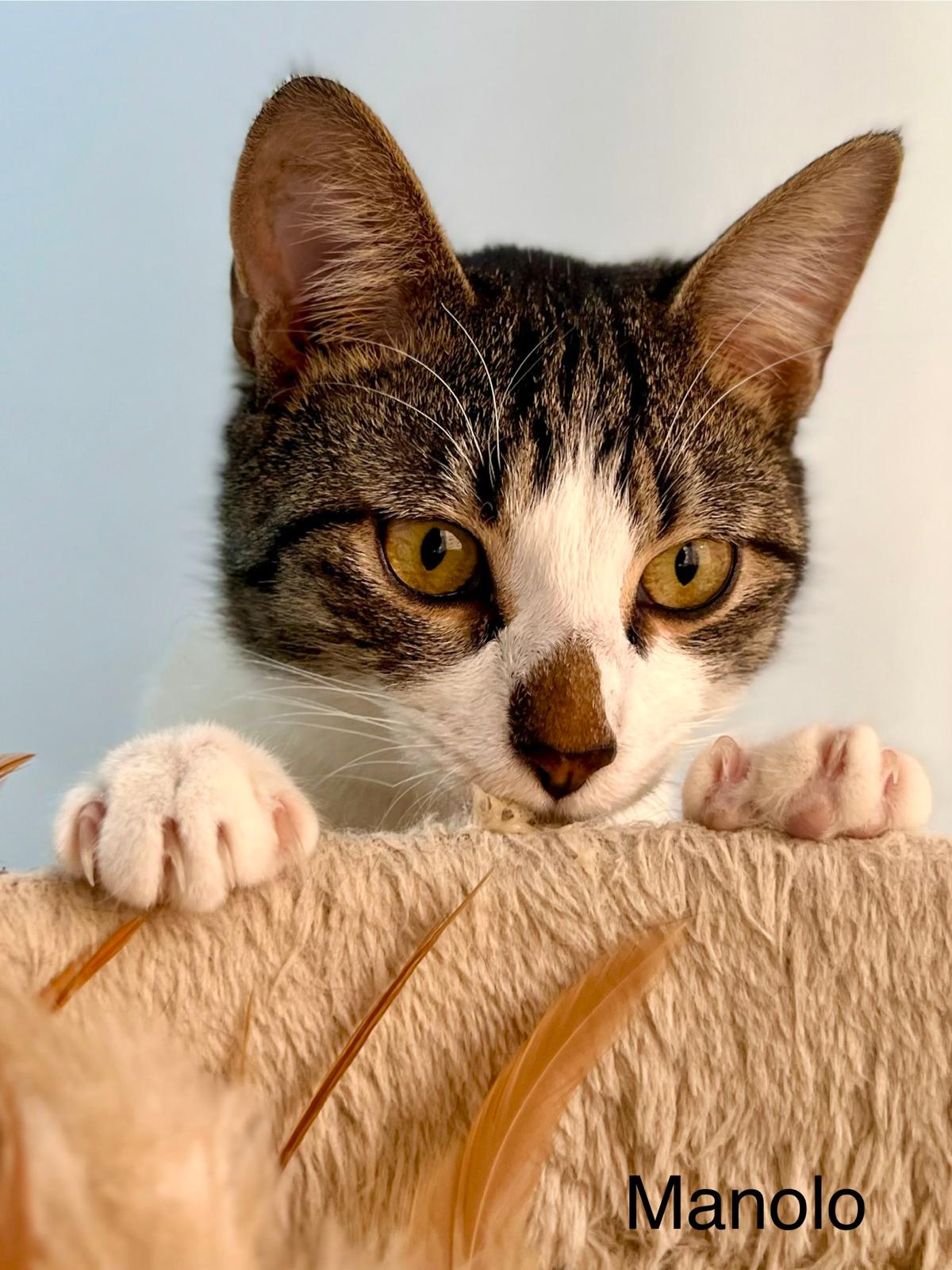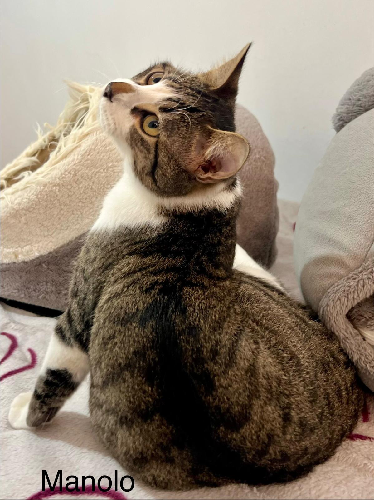 Manolo Este precioso gatito es una víctima inocente de un problema social. La persona que lo tenía en casa entra en una situación de precariedad extrema y saca a sus gatos a la calle. Con mucho miedo, sin refugio y sin comida , malviven entre los coches y comen gracias a algún vecino compasivo. HC, a pesar de la saturación que sufrimos, decide rescatarlos. Muy joven y con muchas ganas de jugar, de ronronear y de que la mimen. Es un gatito especial que se merece un hogar donde pueda vivir feliz y seguro, alejado de la precariedad. Si te animas a adoptarle envía un whatsApp al 616447161.