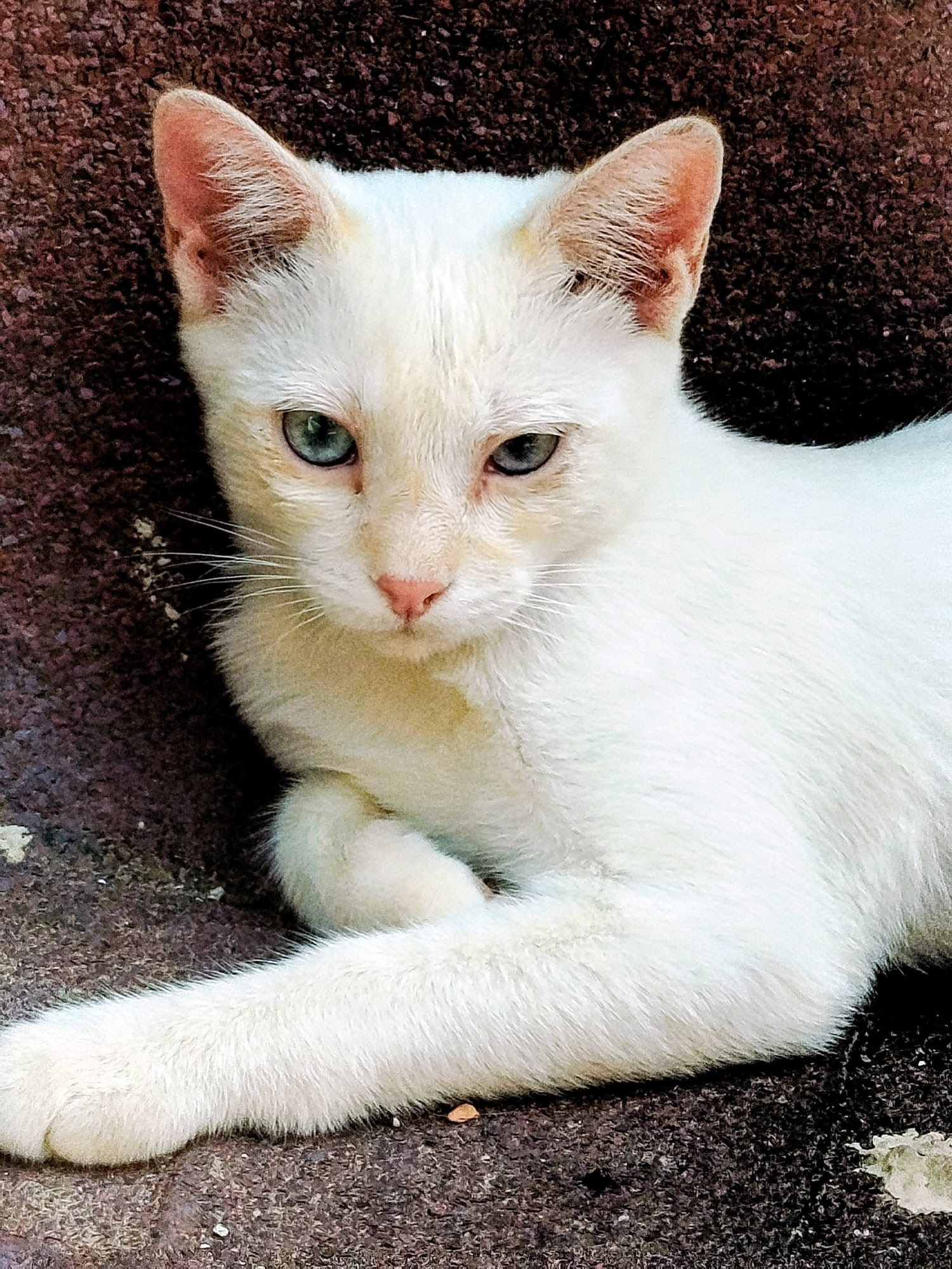Tiene ojos azules delicados, se le suelen congestionar con frecuencia Es muy tranquilo. Convive bien con otros gatos , NO es dominante . Con las personas le cuesta confiar por miedo, una vez que consigues cogerlo se queda en tus brazos horas ronroneando