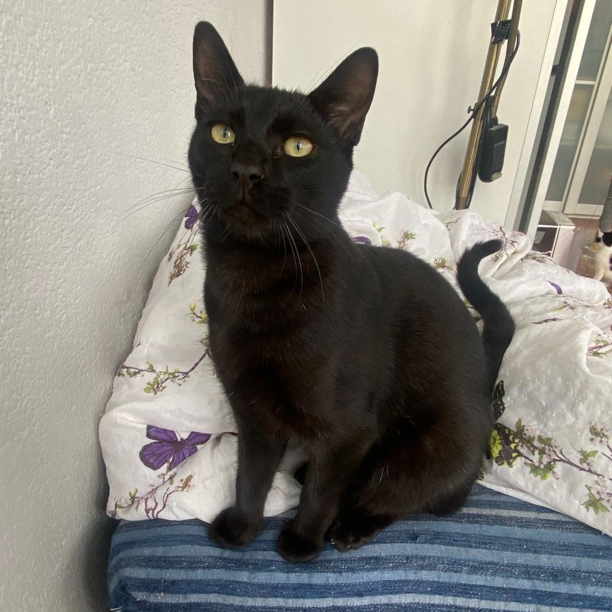 Se recogió de la calle unos dias antes de Halloween, junto a sus hermnanos que tambien eran negros, ya que confiaban en las personas y estaban en riesgo de que alguien los cogiera con malas intenciones. Desde entonces viven en una habitación de acogida però estan deseando encontrar un hogar.