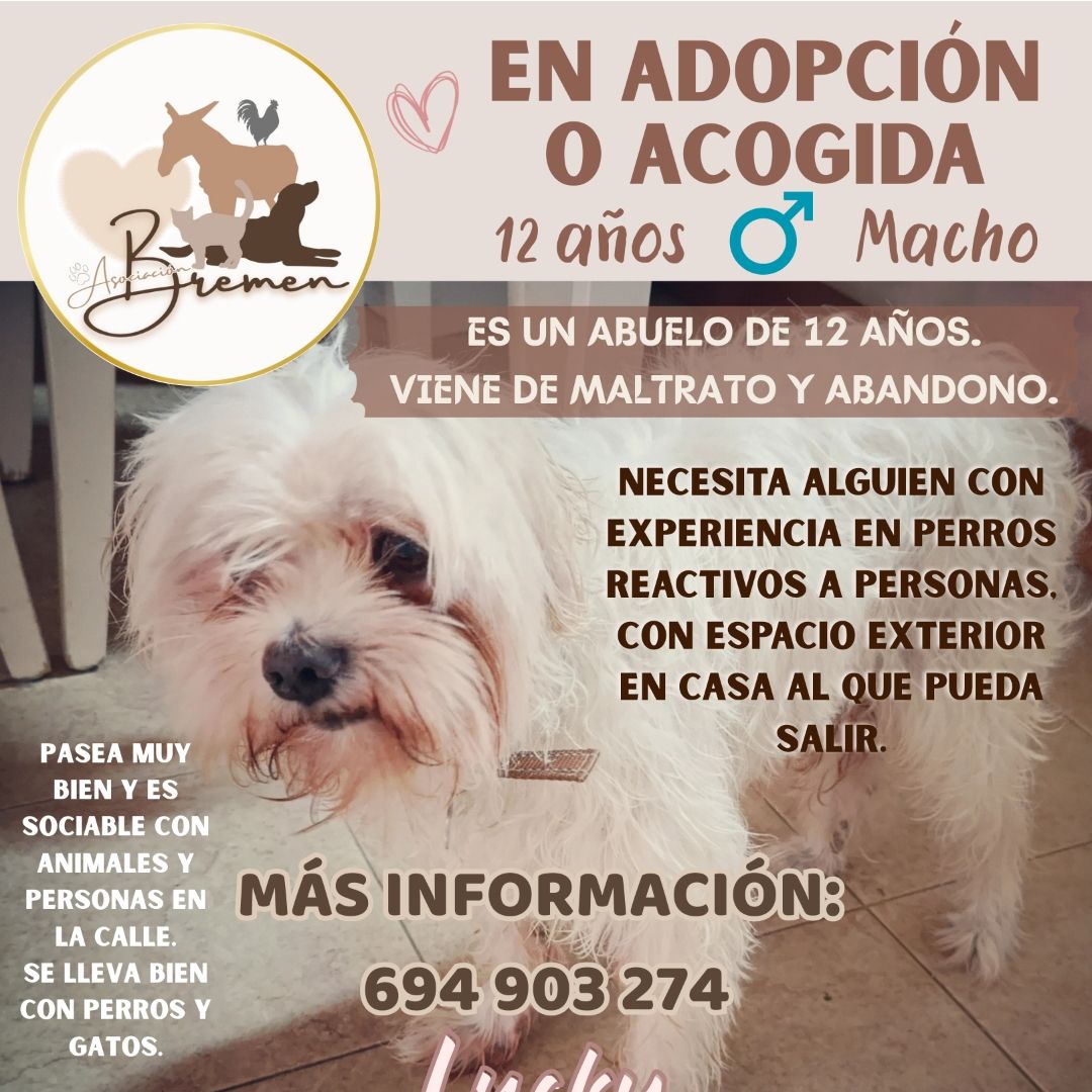 Apareció abandonado y maltratado, delgado y con poco pelo, muy asustado y reactivo con personas. Busca casa de acogida o adopción en una casa tranquila, sin niños y con personas capaces de reconducir sus conductas agresivas en interior a personas, lo ideal es una casa con terreno o espacio exterior para que pueda salir, en exterior no es reactivo.