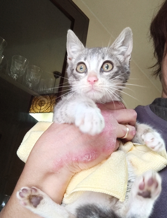 Rescatado junto a su hermana de una colonia que se está controlando. En esta colonia hay muchos bebes y están muy desnutridos, ahora se les está alimentando y dando cuidados veterinarios pero urge sacar de la calle todos los bebes que podamos.