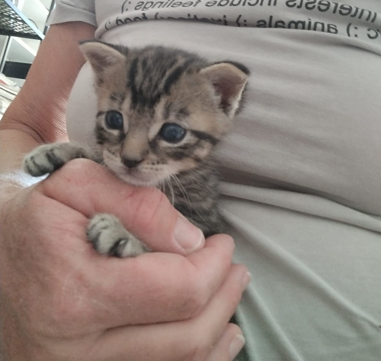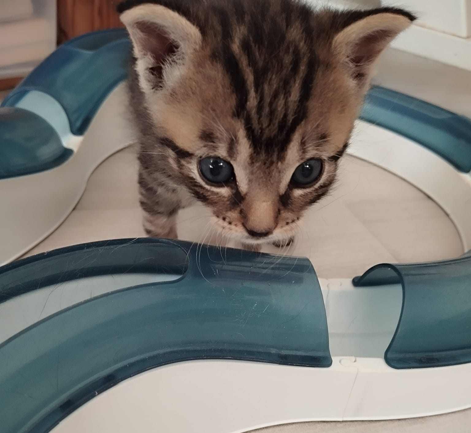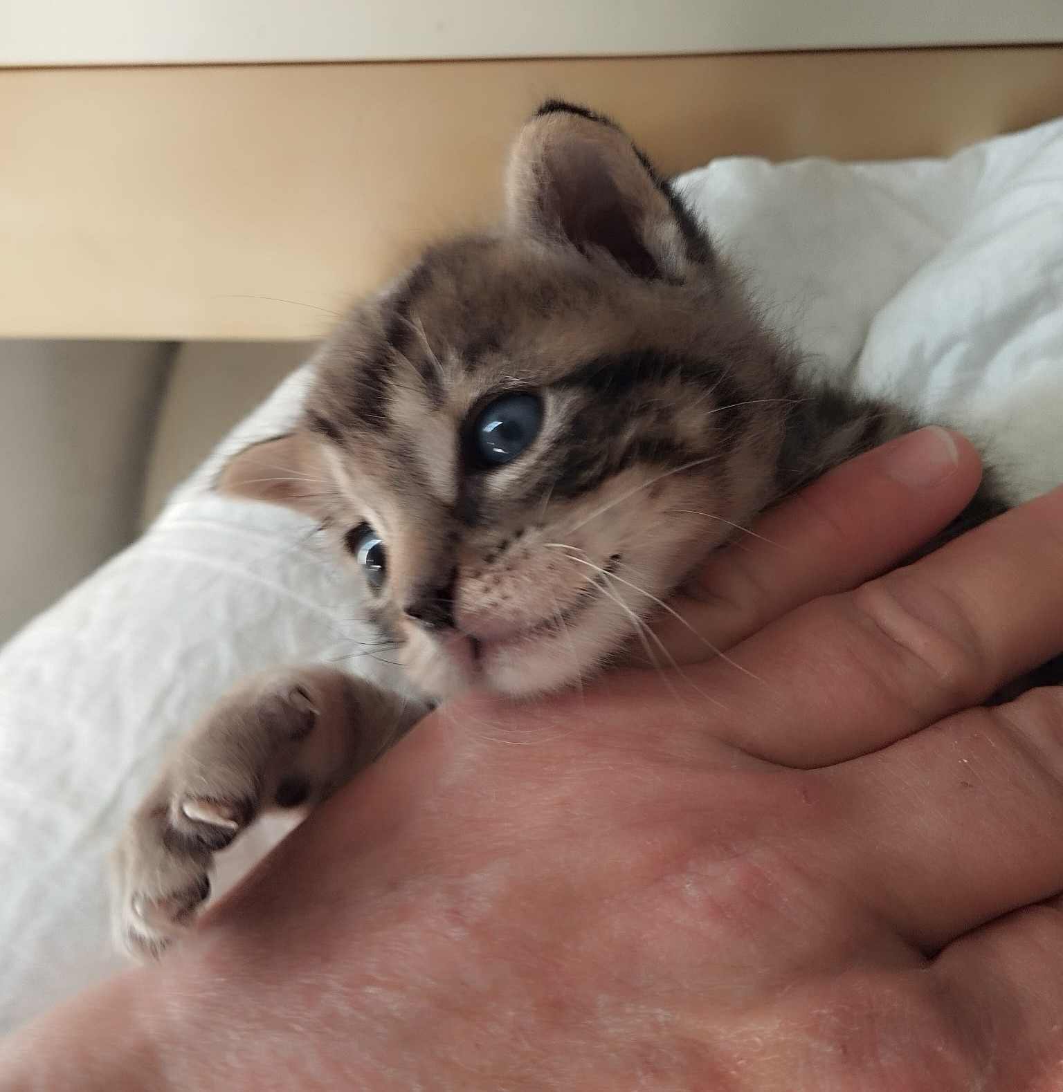 rescatado junto a su hermano de una caja de cartón tirada en la basura con una semana de vida. Criado a biberón, es un bombón de gatito.