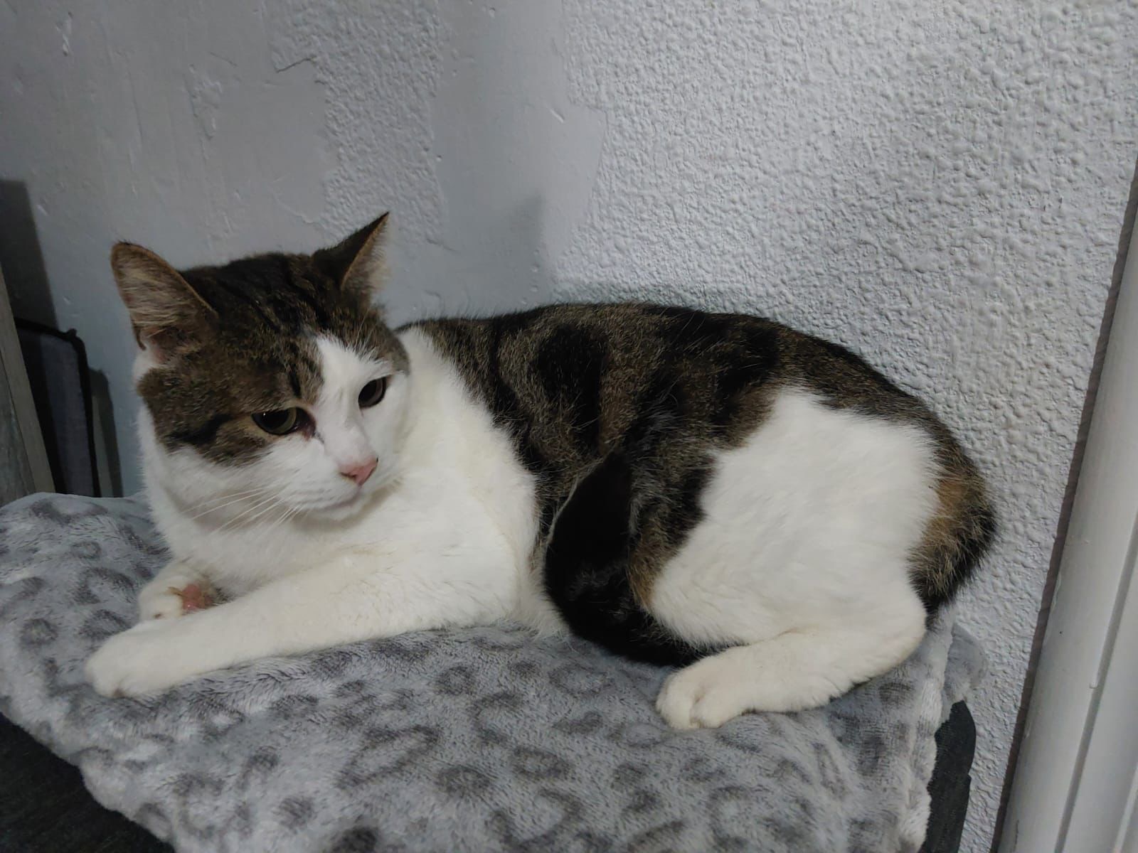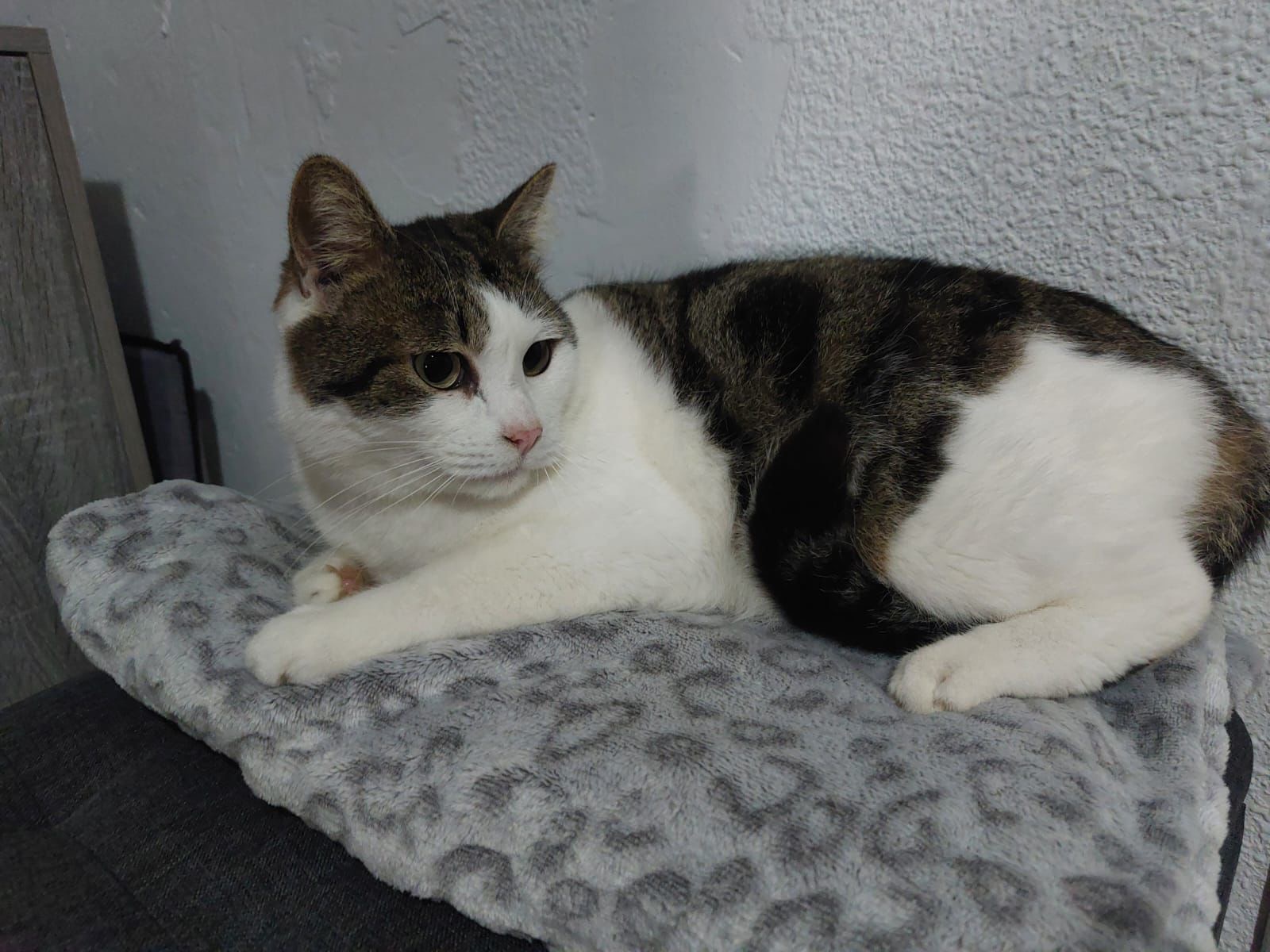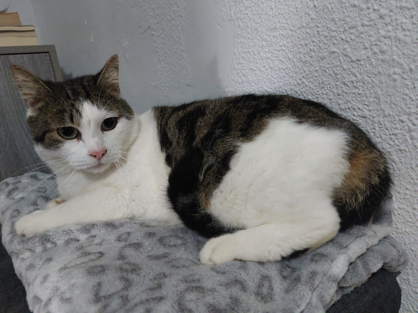 Rígel, machito gris y blanco de 3 años. Dulce y cariñoso aunque un poco tímido al principio. Apto con perros y gatos. Está en Córdoba pero puede viajar. Preferiblemente adopción en Madrid. Imprescindible protecciones en ventanas y terrazas