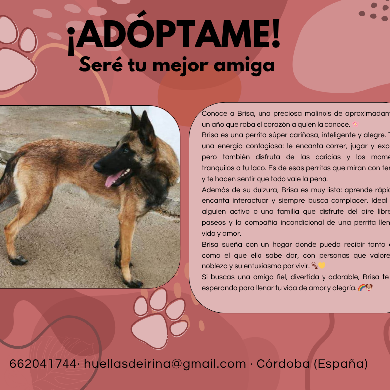 ✨ Brisa busca familia ✨ Tiene solo 1 año y es pura alegría: cariñosa, muy lista y llena de energía positiva. Le encanta aprender, jugar y dar amor sin medida. Si buscas una compañera fiel, activa y adorable… Brisa te está esperando con el corazón abierto. 💛🐶