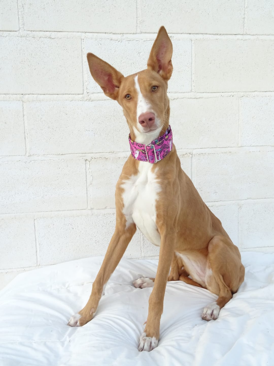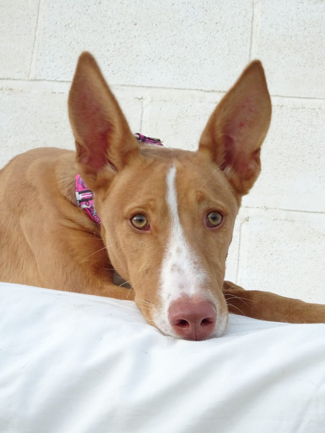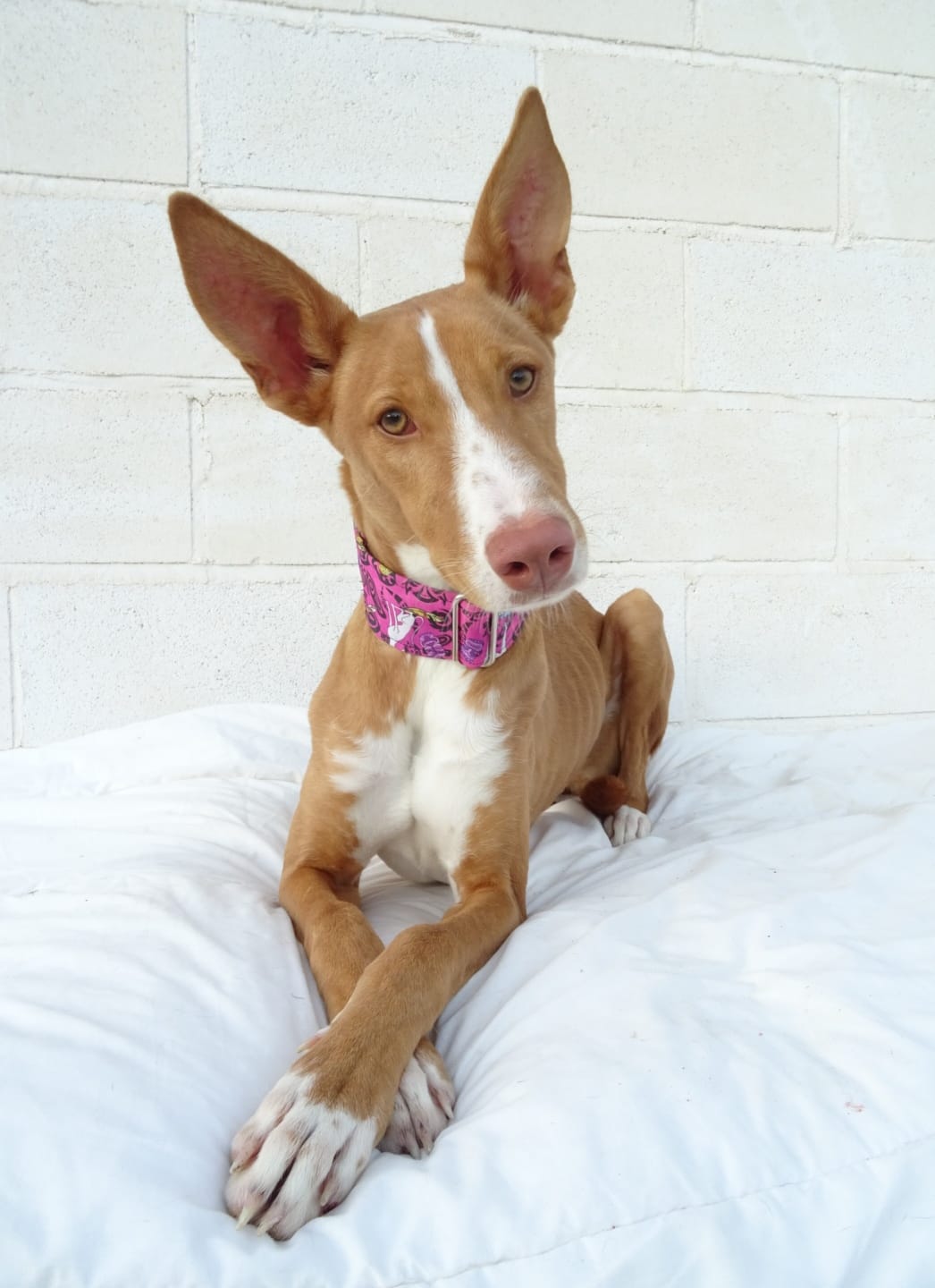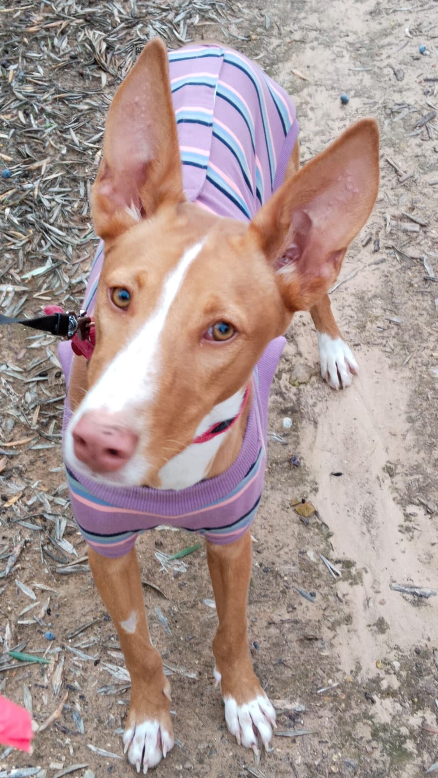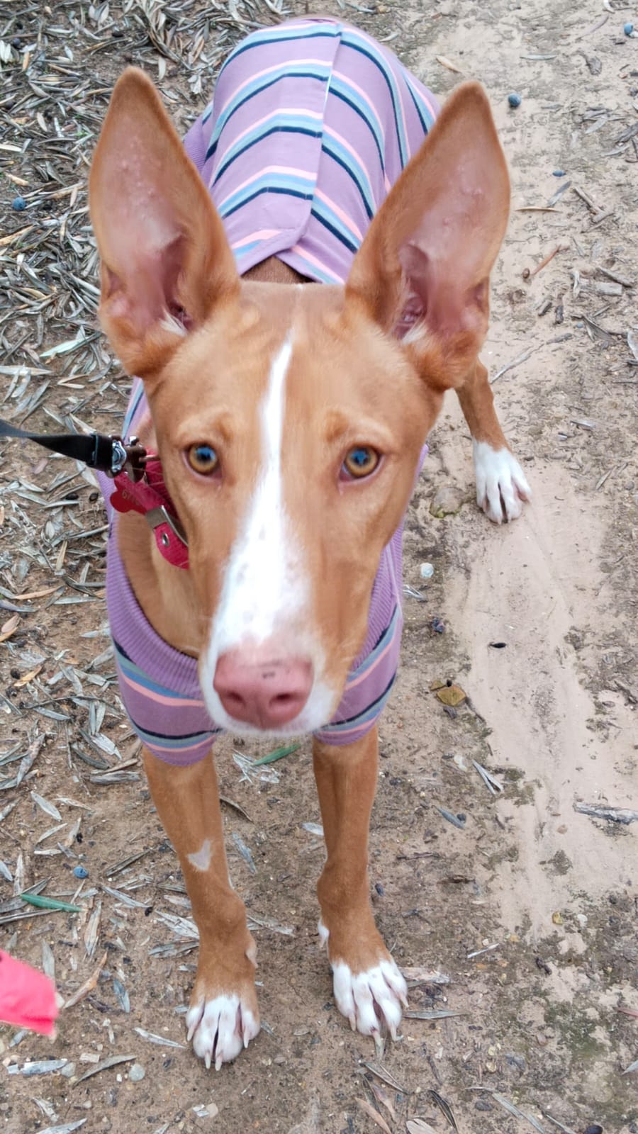 *DAMA* Sexo: hembra Raza: podenca Fecha de Nacimiento: 01.02.2025 Peso est.adulto: 16 kg Carácter: dulce, divertida, cariñosa y activa. Apta con gatos.