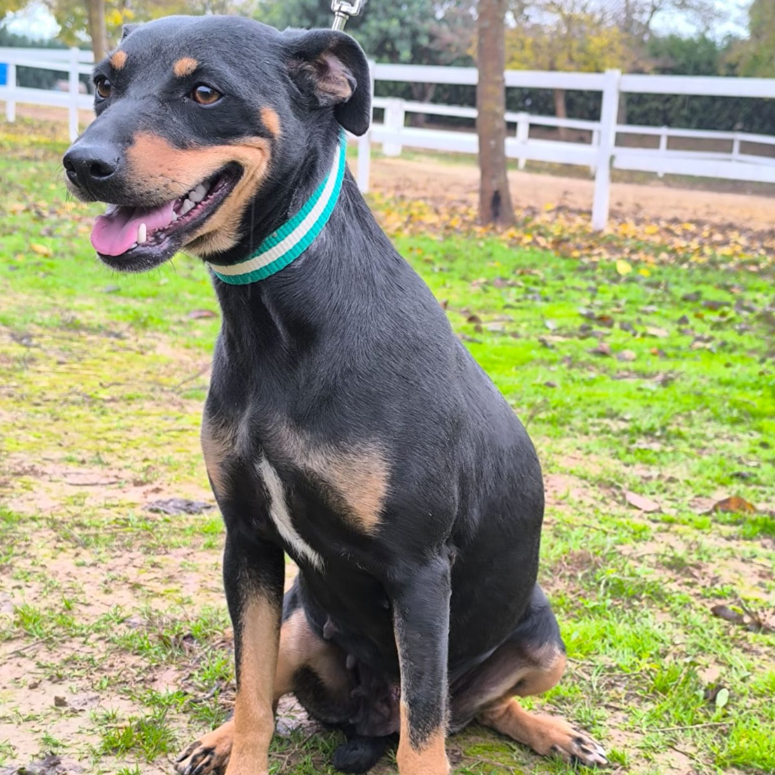 Perra tipo mix-pinscher en adopción. Moon es de tamaño pequeño-mediano, muy cariñosa y activa, ideal para una familia que disfrute de paseos diarios y juegos al aire libre. Se lleva bien con las personas, es sociable y solo necesita un hogar responsable donde pueda recibir atención, cariño y seguir aprendiendo normas básicas.