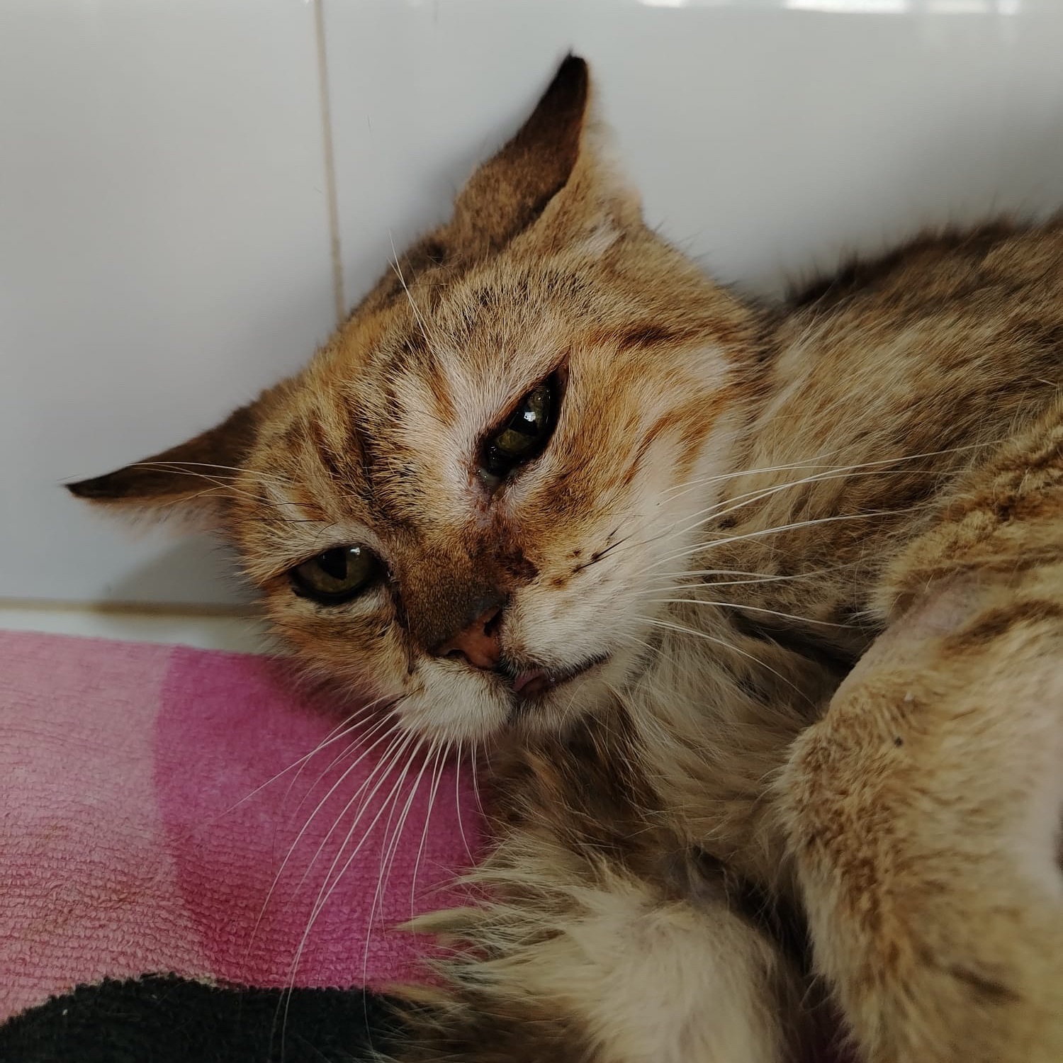 Dulce fue recogida el 05/10/2025 atropellada. Se llevó de inmediato al veterinario. Ya está recuperada pero no podemos sacarla del veterinario porque no tenemos adopción para ella… Está muy triste por estar en una jaula sola en el veterinario…