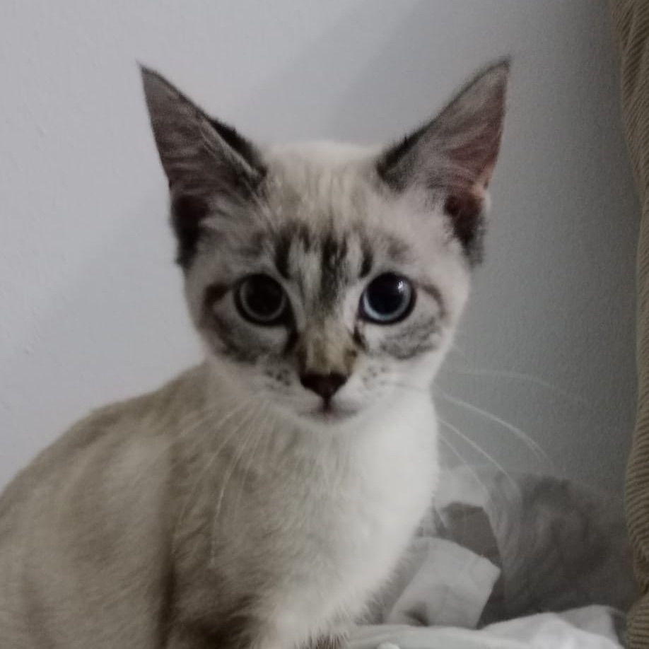 Tiene unos 4 meses. Se dejó coger de inmediato al brazo. Se lleva bien con perros y con gatos, es súper sociable. Ronronea a todas horas