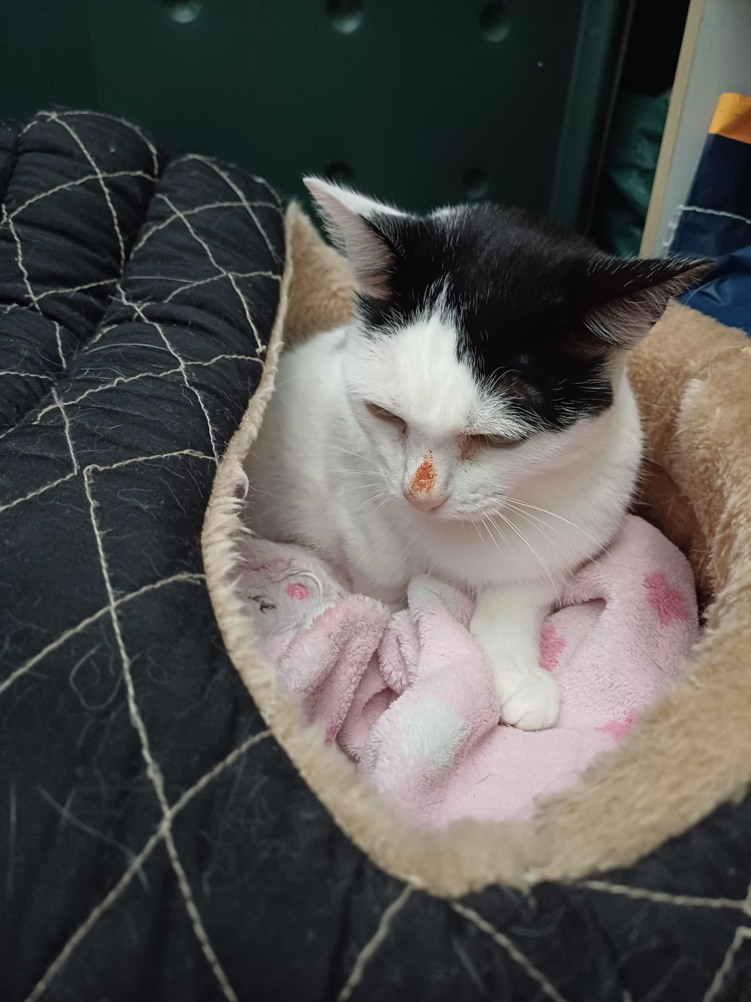 Suny fue abandonada en una de nuestras colonias. Una buena familia la adoptó pero su gato le pega y le hace heridas (lo podéis ver en la última foto). Necesitamos una adopción urgente porque está encerrada en una habitación.