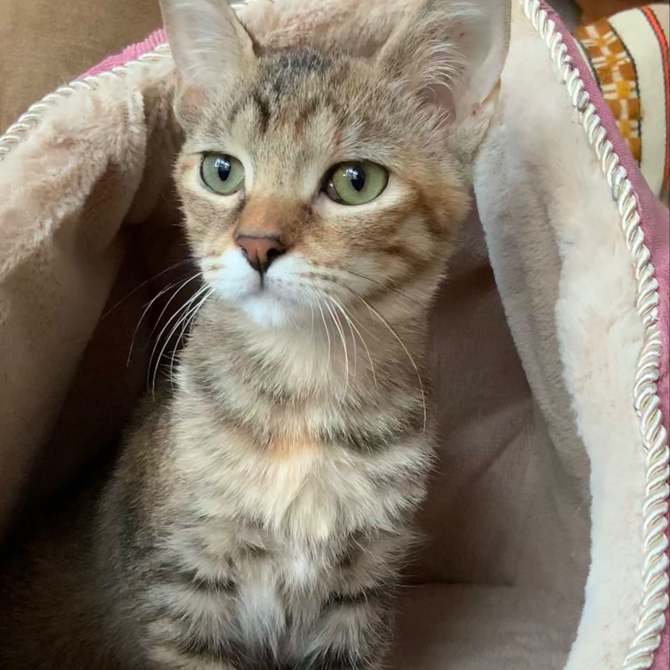 Es tímida y muy chiquitina de tamaño. La rescatamos con una enfermedad (PIF) que detuvo su crecimiento durante tiempo en 900 g, aunque a raíz de tratarla comenzó a desarrollarse, y actualmente pesa 1,9 kg. Cualquier gesto de atención lo agradece con un fuerte y continuo ronroneo. Es muy cariñosa y está muy necesitada de minutos.