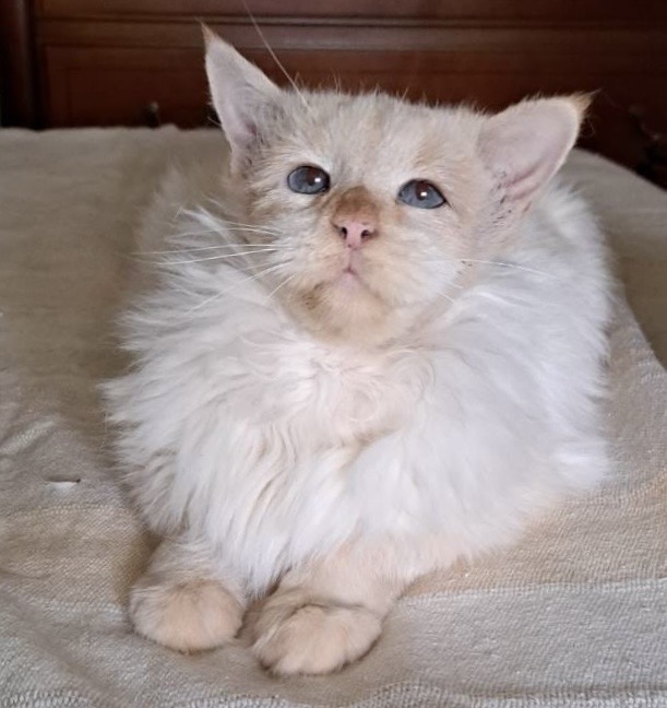 Vida es muy dulce y cariñosa. Le encanta estar acurrucada en los brazos. Ha pasado un largo proceso de recuperación, dado el estado de desnutrición y deshidratación severa en el que la rescatamos. Tenía una profunda y extensa herida en la parte baja el cuello, la tirantez que ésta le provocaba es la causa de que sus párpados se inclinen hacia abajo y sus orejitas parezcan lateralizadas.