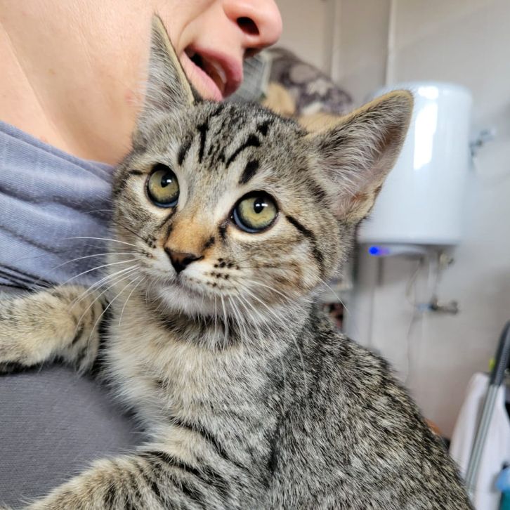Shin fue rescatado junto a sus 4 hermanitos del cementerio del pueblo, donde una persona decidió abandonarlos. Estaban asustados debajo de un coche, pero en cuanto les pusimos un poquito de comida, salieron a por ella! Pobres, habrían pasado hambre y sed, y estaban desorientados.