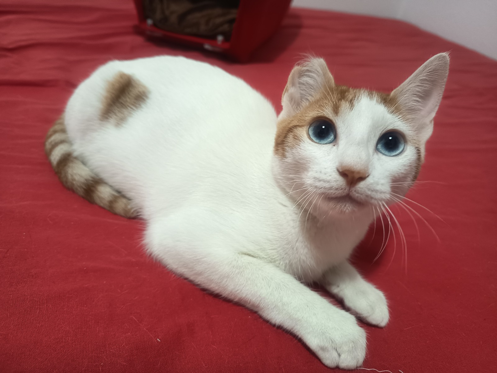 Se acercó al restaurante donde trabajábamos buscando comida, vimos que estaba mal, la capturamos y la llevamos al veterinario donde diagnosticaron que venía desnutrida, deshidratada, con pulgas y con una herida en la oreja. Tras varias visitas al veterinario y cuidados en casa está totalmente recuperada. Convive y juega con nuestros 6 gatos y tiene una actitud muy buena y cariñosa.