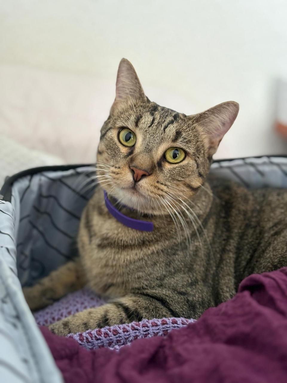 Fue encontrada en el centro de granada sola y embarazada, en una calle muy transitada. No se ha encontrado a su familia pero su comportamiento no es salvaje. Probablemente fue abandonada.