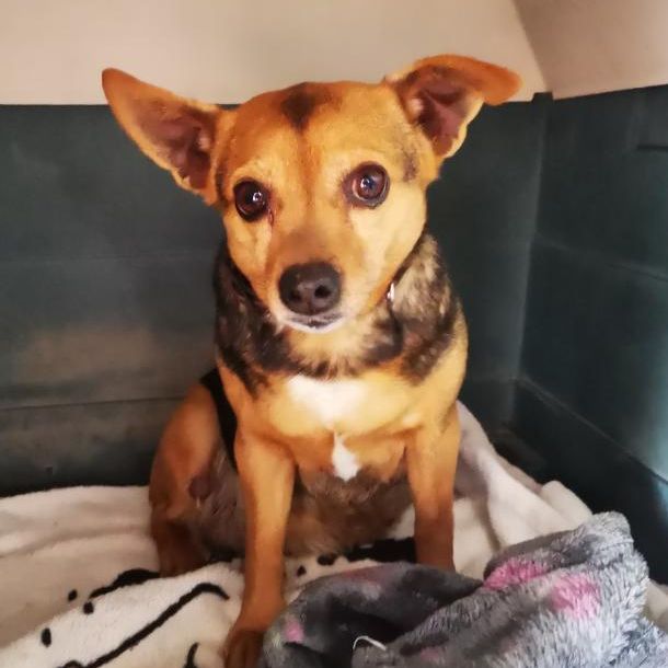 Aunque acabamos de rescatarla y aún le falta coger confianza, Chica es una perra muy buena. Faldera y le encanta estar en brazos.
