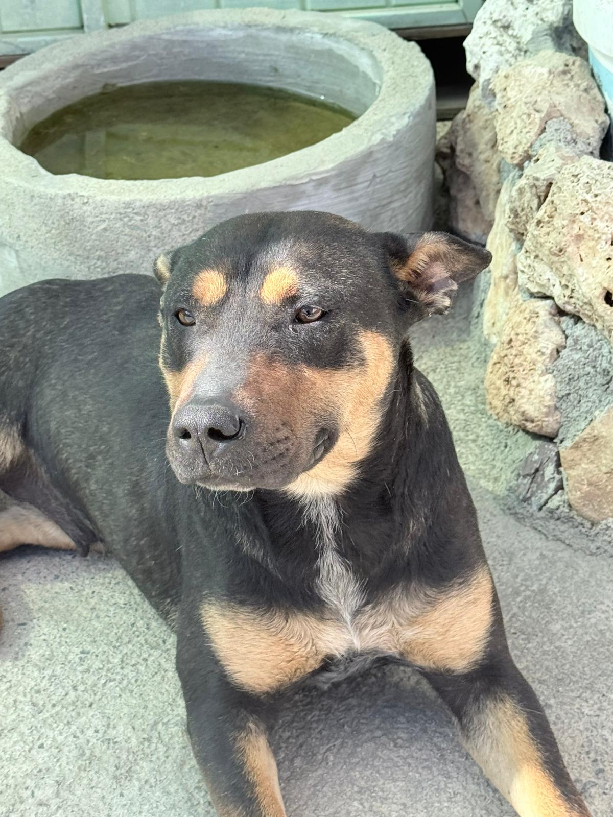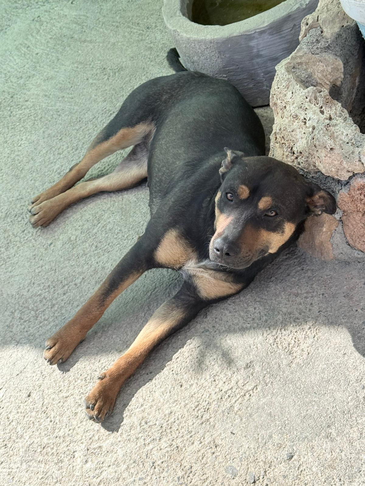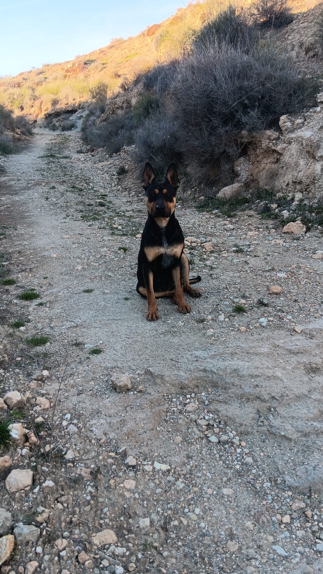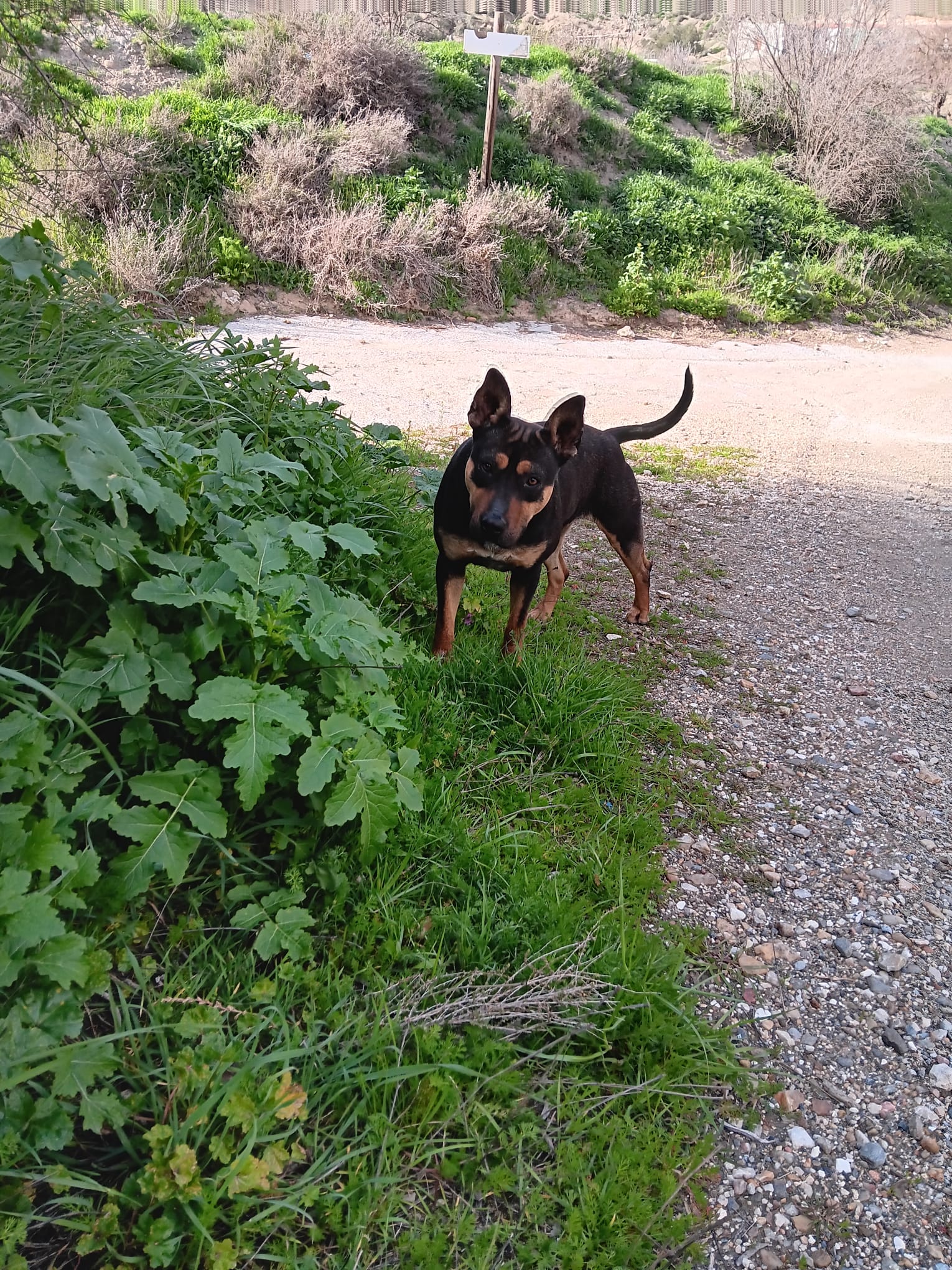 Se la encontraron unos chicos por la calle , muerta de sed , debía llevar mucho tiempo sin beber,la llevaron al Veterinario y no tenía chip , es una perrita muy buena