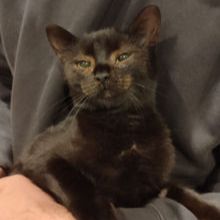 Gatita negra, con una capa visible con cierta luz algo diferente. Buen carácter. Lo tiene difícil por su color.