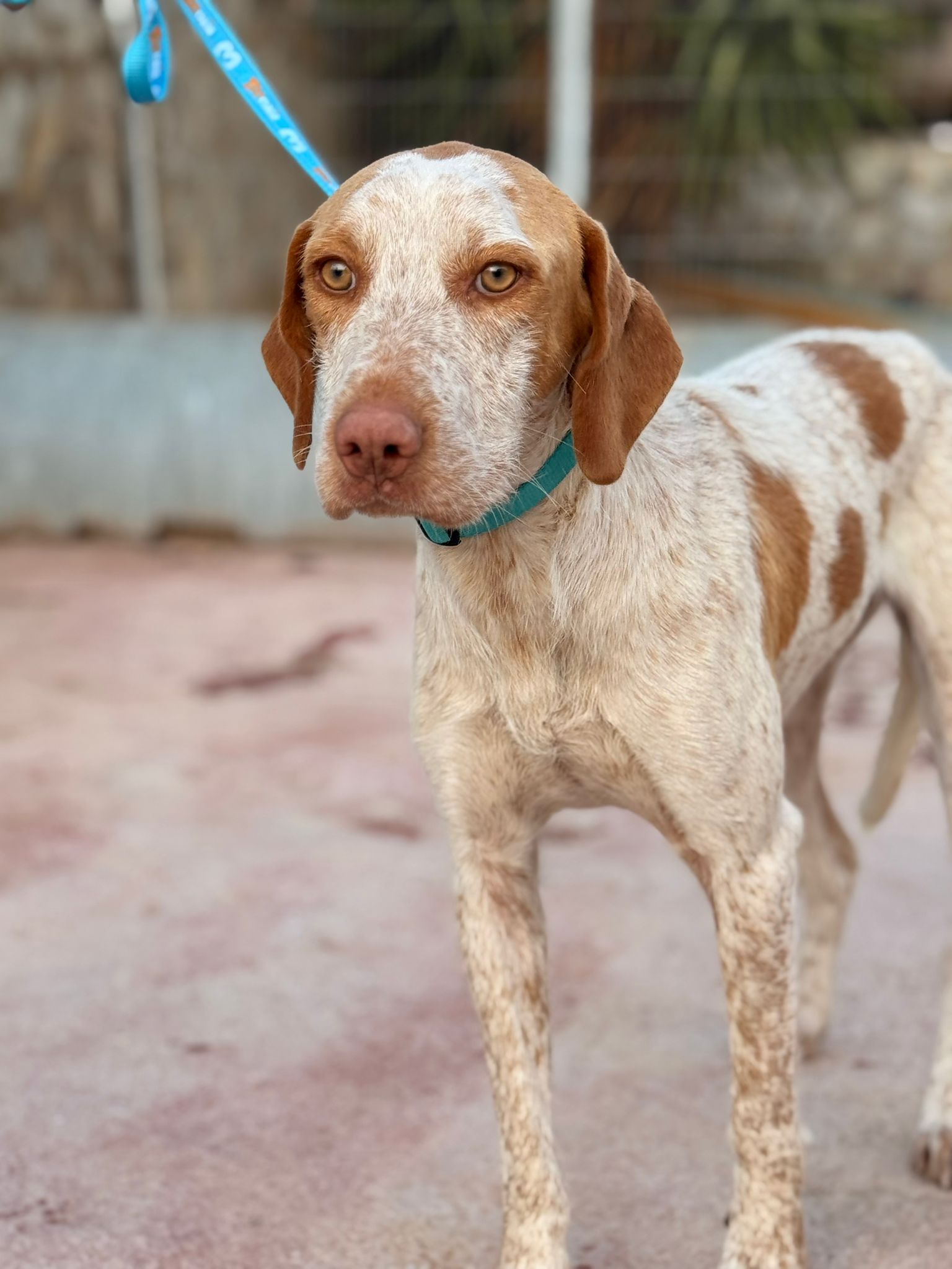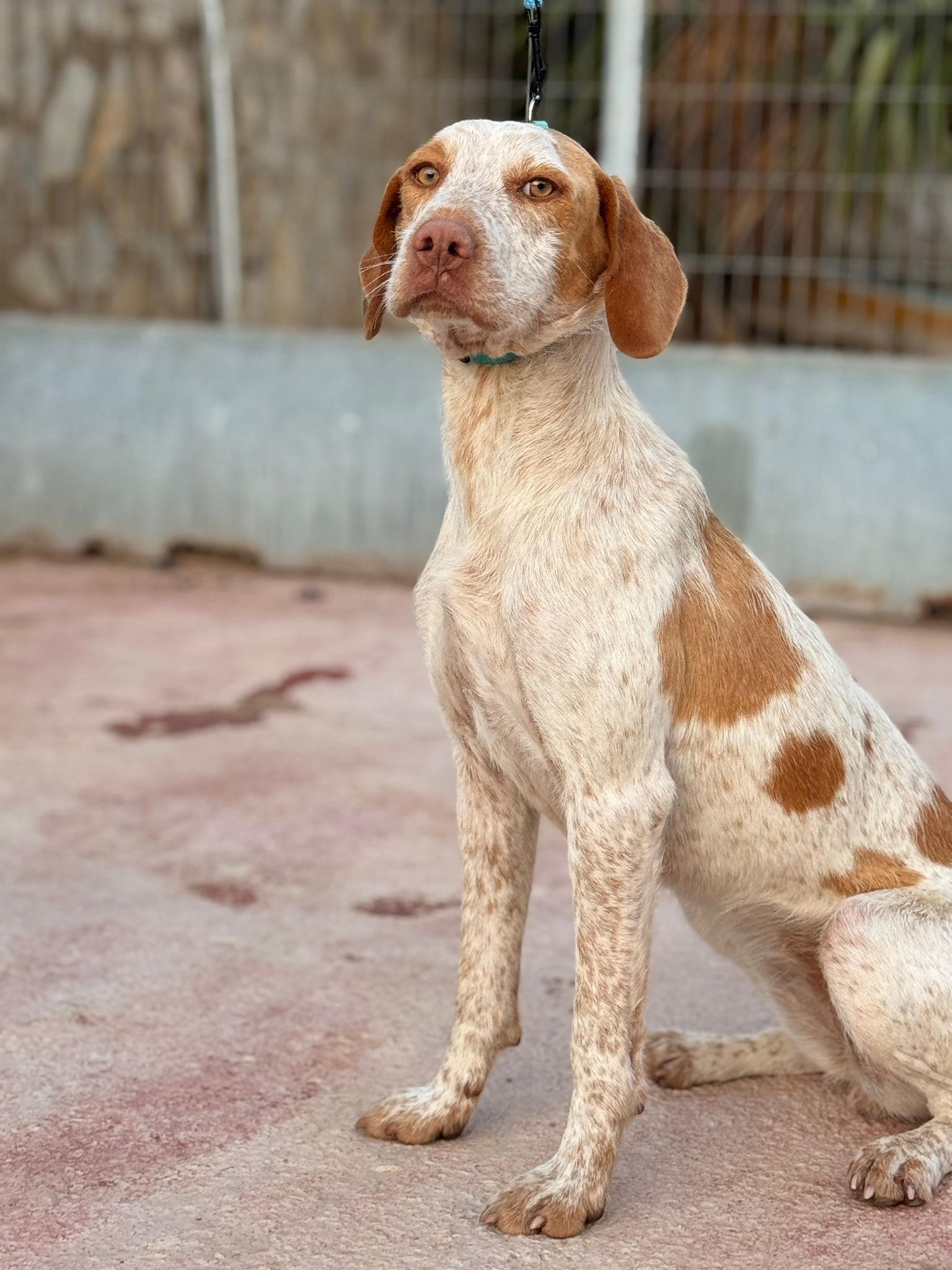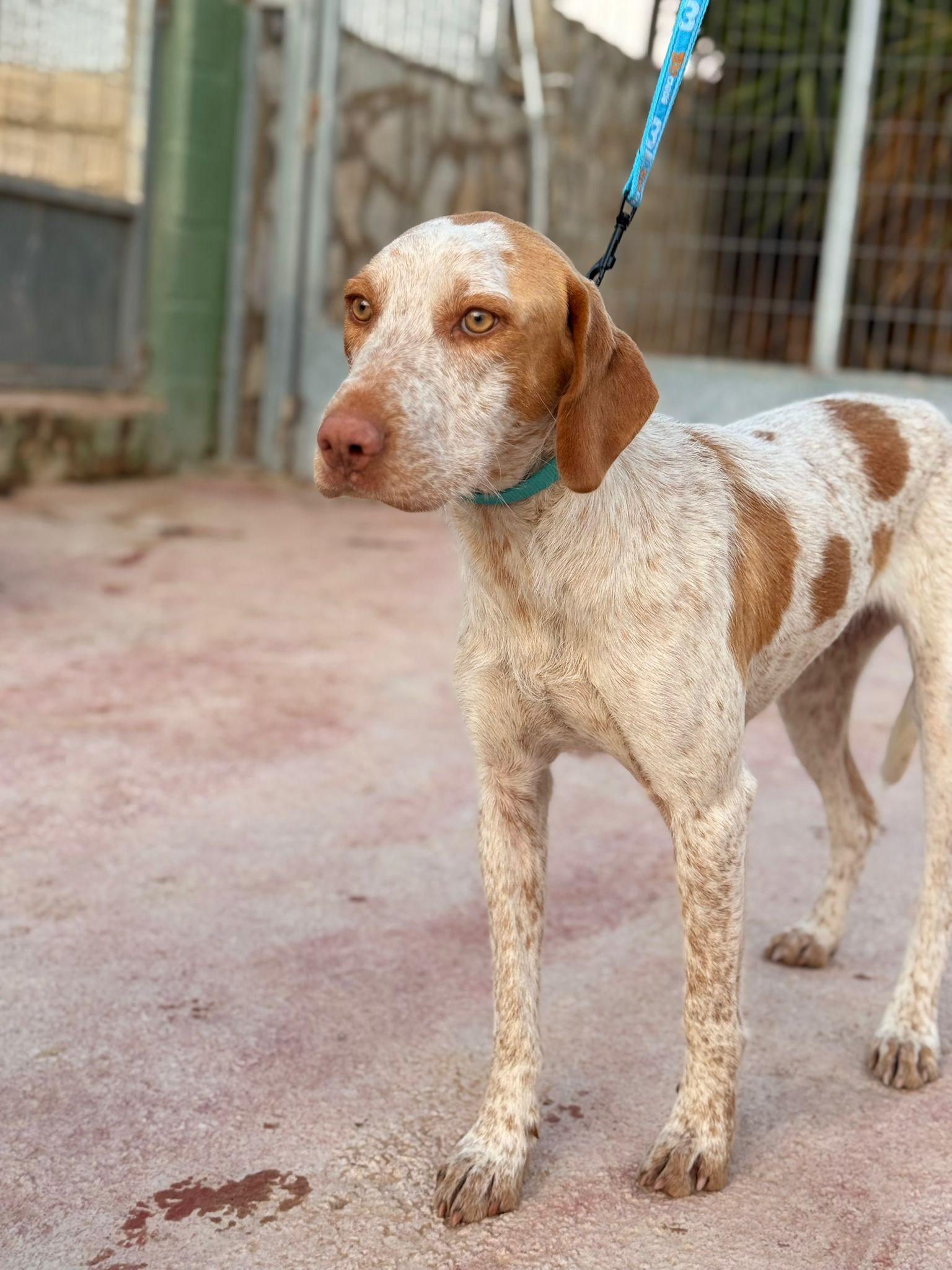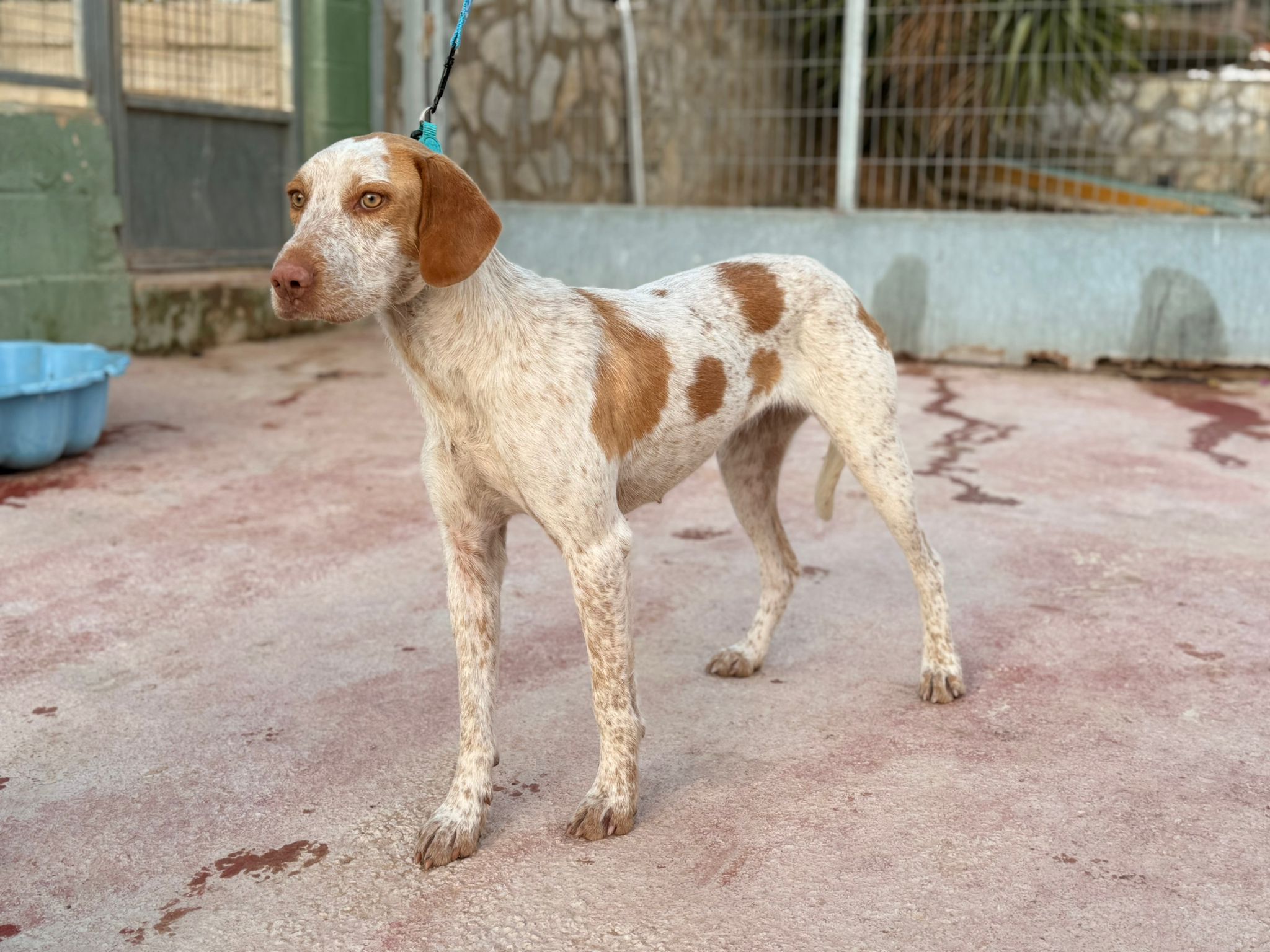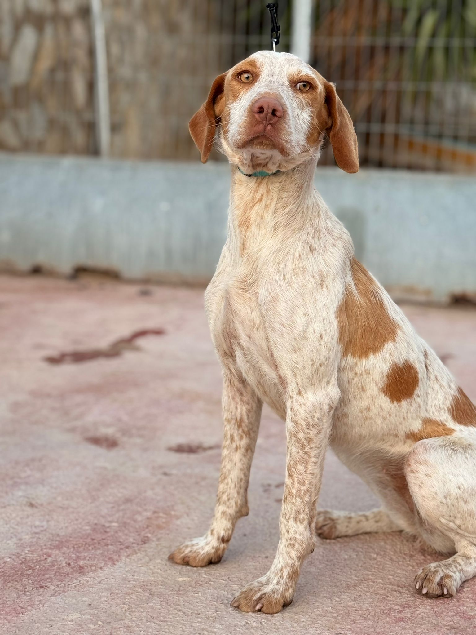 Mel fue recogida hace dos semanas tras llevar varios días abandonada junto a otro perro el cual no pudimos rescatar porque no se dejaba coger. Al principio es un poco tímida pero en cuanto coge confianza es super cariñosa, noble y tiene un carácter increíble. Además es totalmente compatible con niños y con perros
