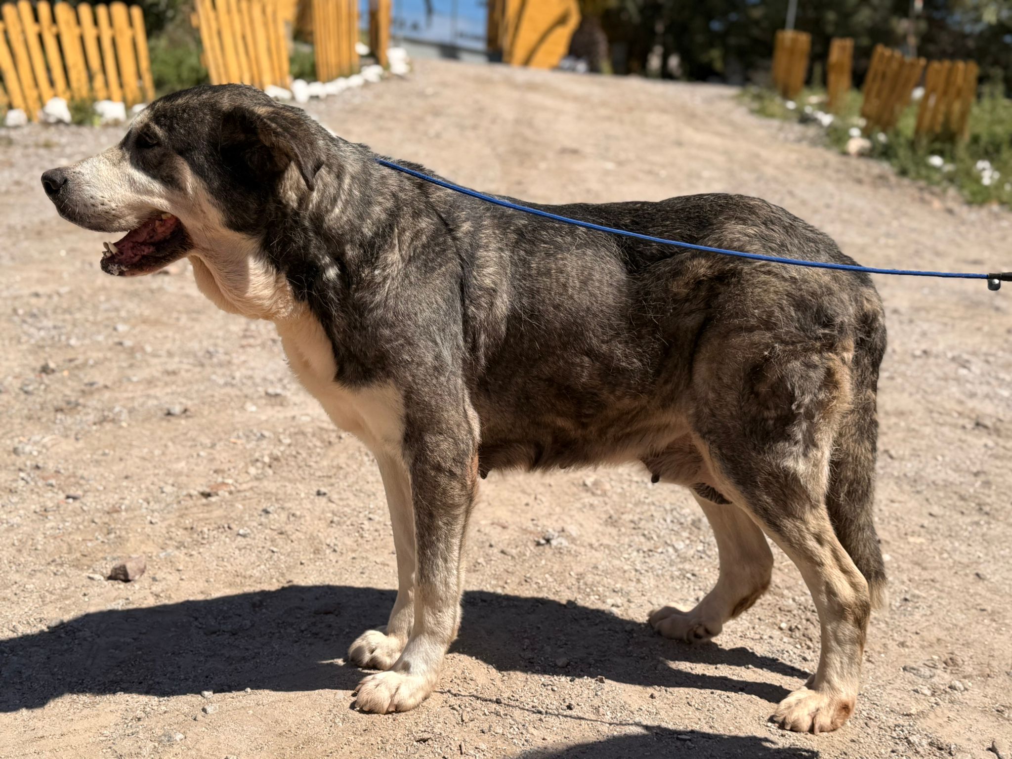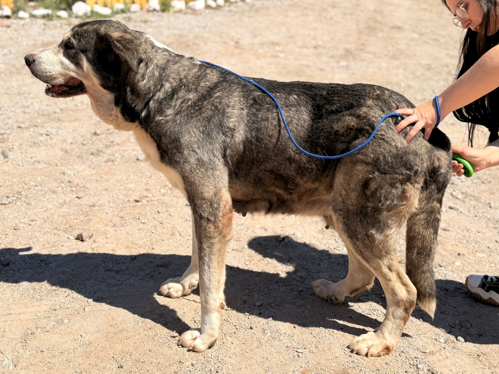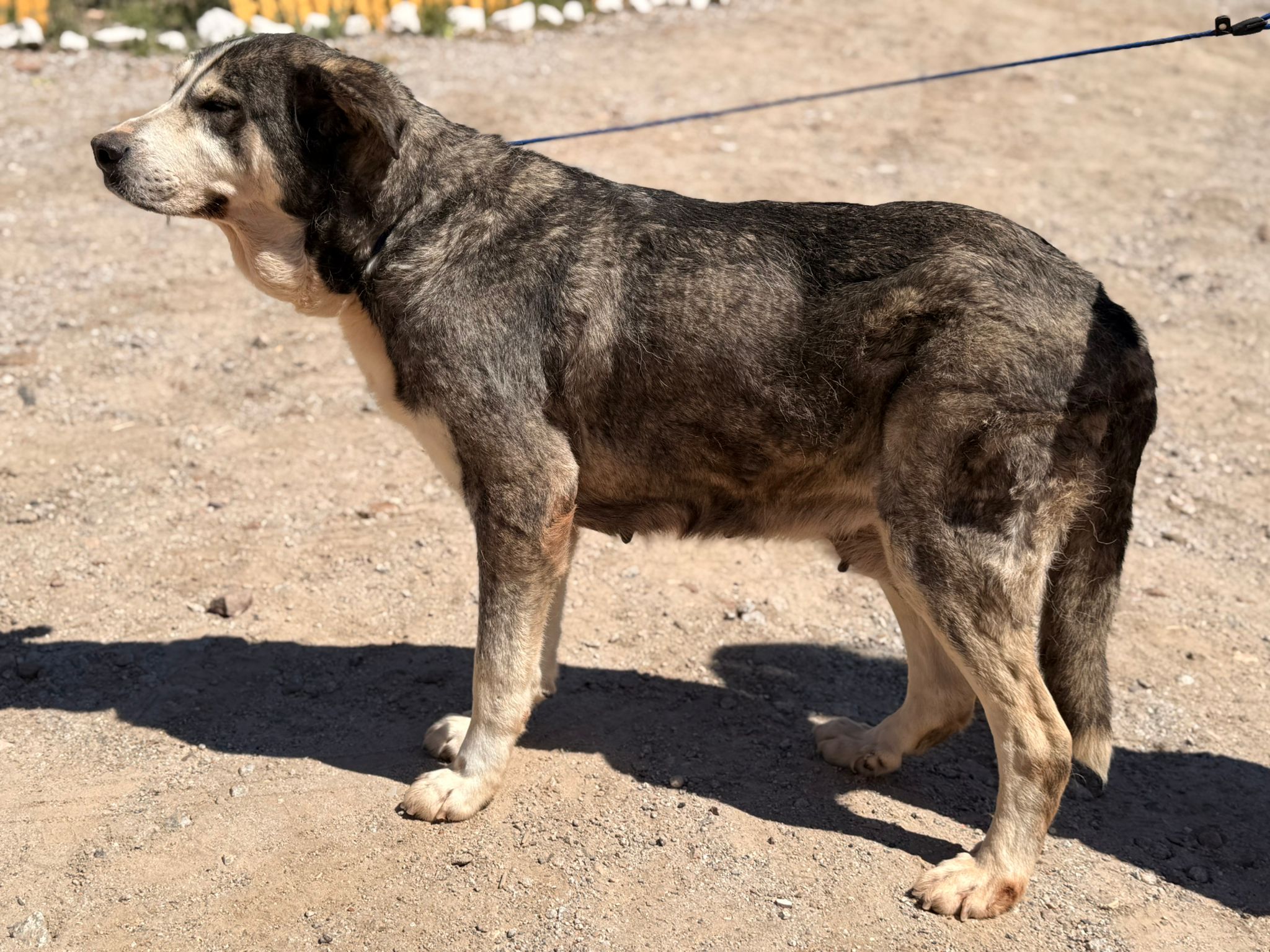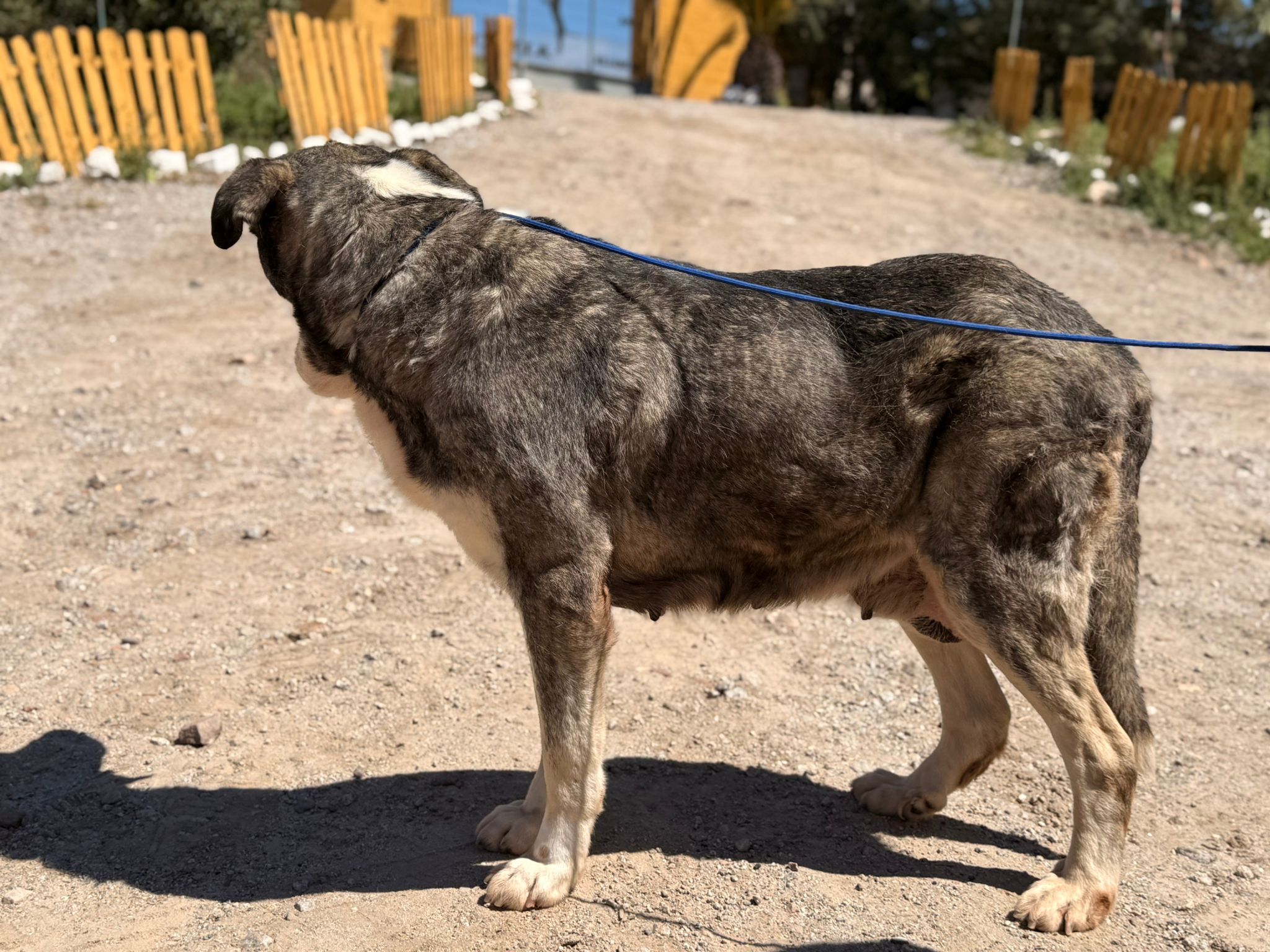 Nina es una mastín que fue rescatada hace dos años tras haber sido abandonada en un pueblo cercano a Linares (Jaén). Pasó dos años en la perrera sin que nadie se fijara en ella, hasta que decidimos sacarla de allí para buscarle un nuevo hogar. Nina tiene siete años y padece un tumor que le extirparemos cuando la esterilicemos, pero a pesar de su edad es muy activa y se lleva bien con todo tipo de perros, gatos y niños. Puede que al principio sea un poco tímida, pero solo necesita un poco de confianza