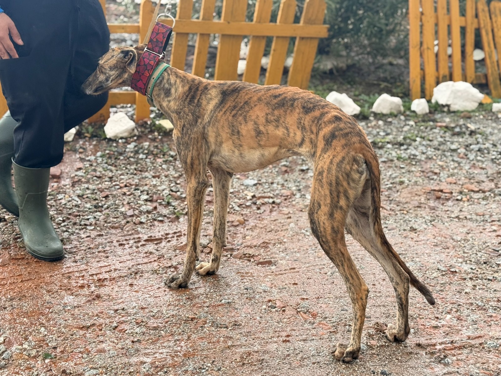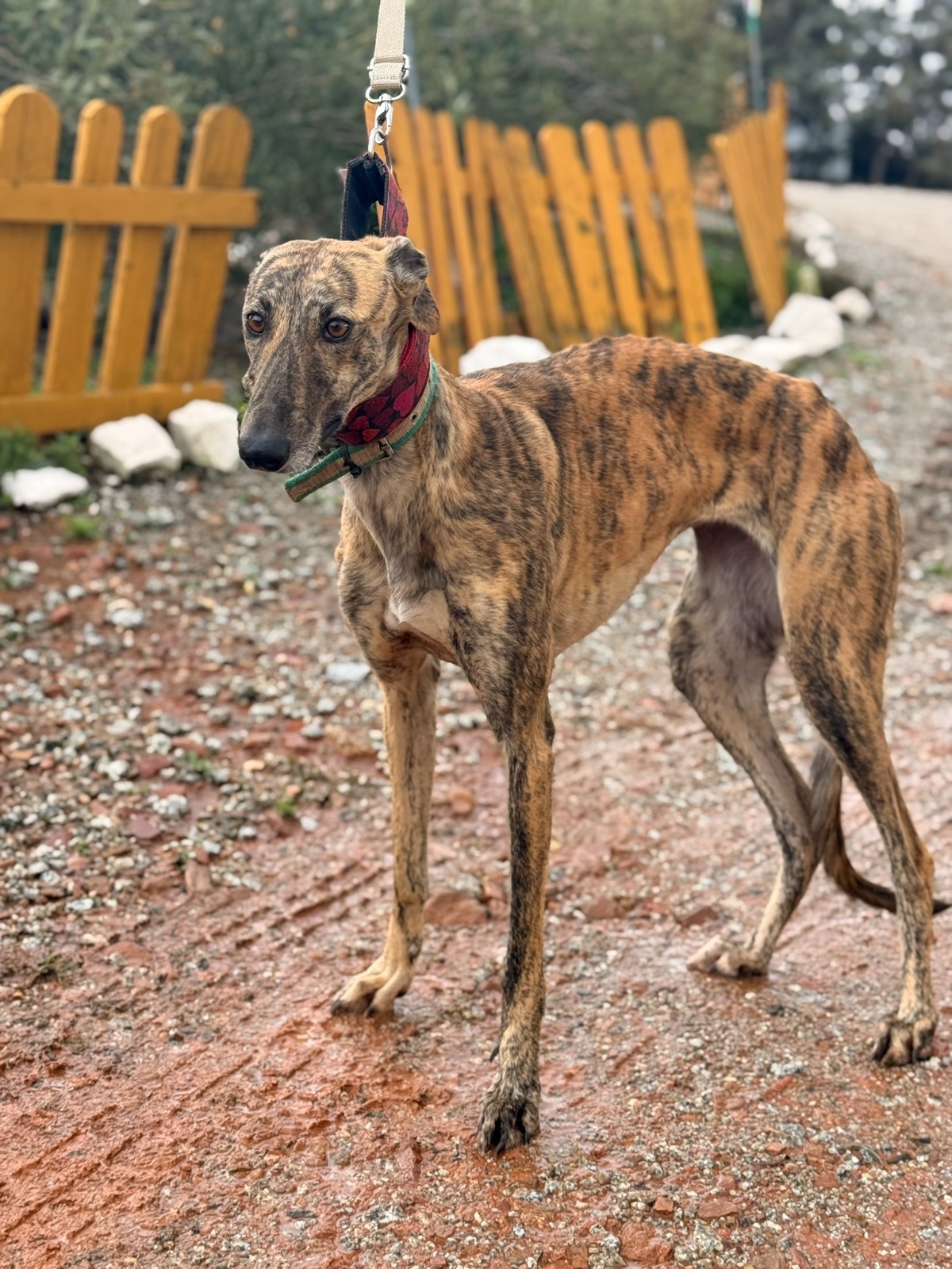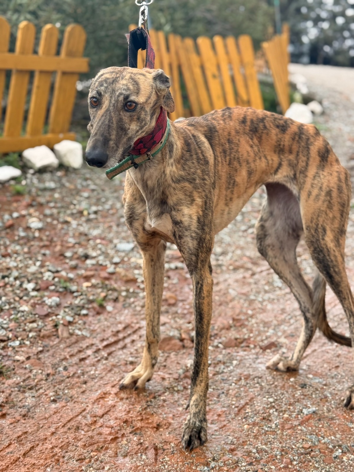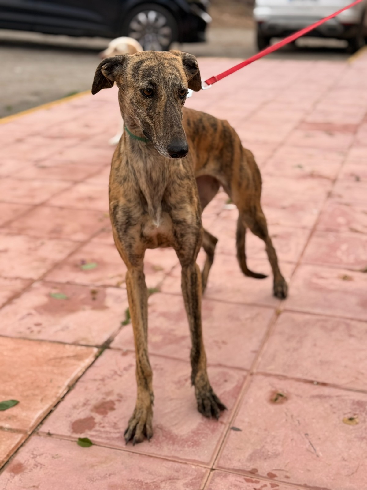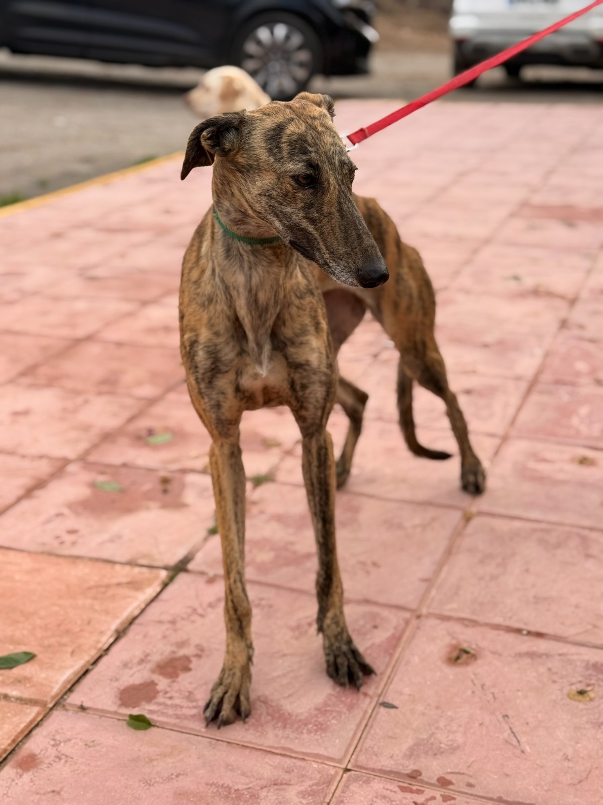 Sissy llegó hace una semana junto a su madre Tessa y a su padre Bravo. Es una galga super joven de tan solo un año y medio cuyo dueño ha entregado a la asociación para encontrar una nueva familia. Al contrario que sus padres Sissy es mucho más confiada, es totalmente compatible con niños y perros. Pasea bastante bien con correa y no está testada con gatos.