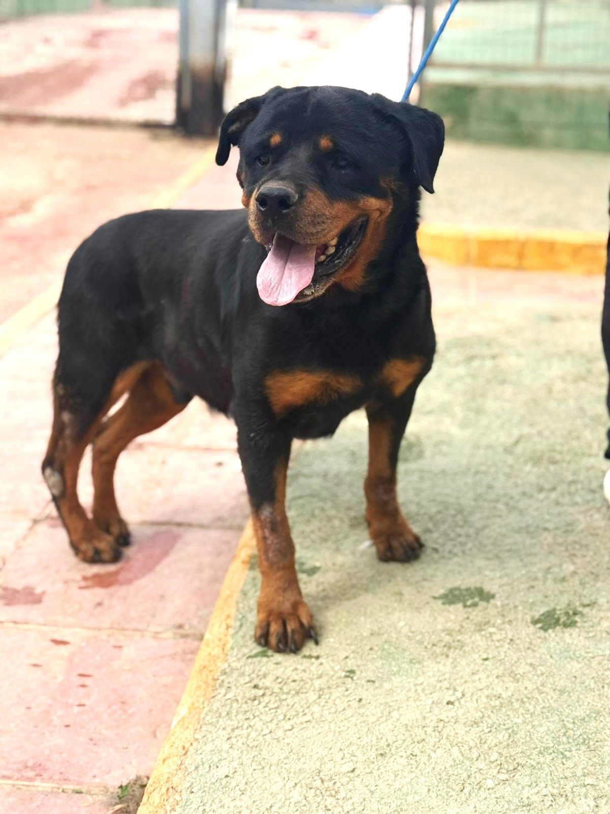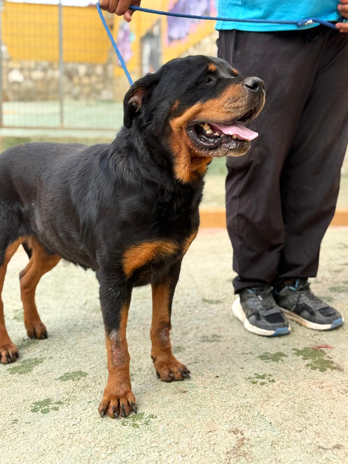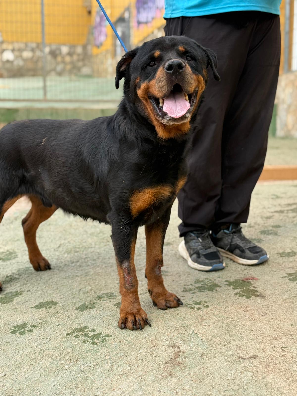 𝗜𝗠𝗣𝗢𝗥𝗧𝗔𝗡𝗧𝗘: 𝗔𝗗𝗢𝗣𝗧𝗔𝗥 𝗧𝗜𝗘𝗡𝗘 𝗨𝗡 𝗖𝗢𝗦𝗧𝗘 Aron es un Rotweiller de 9 años que fue cedido por su propietario a la perrera de Córdoba. Tras varios meses viéndolo allí decidimos sacarlo para intentar buscarle una nueva oportunidad ya que notamos que cada día lo veíamos más triste. Aron tiene Leishmaniosis pero por suerte está totalmente controlada y no tiene ningún órgano afectado. Solo debe tener un control según paute el veterinario y tomar Allopurinol todos los días. También va a ser operado de una rotura de ligamento cruzado por lo que le conviene tener una vida tranquila sin llegar a ser sedentario del todo. Se lleva bien con todo tipo de perros pero preferiblemente con hembras, es totalmente compatible con niños y NO es apto con gatos
