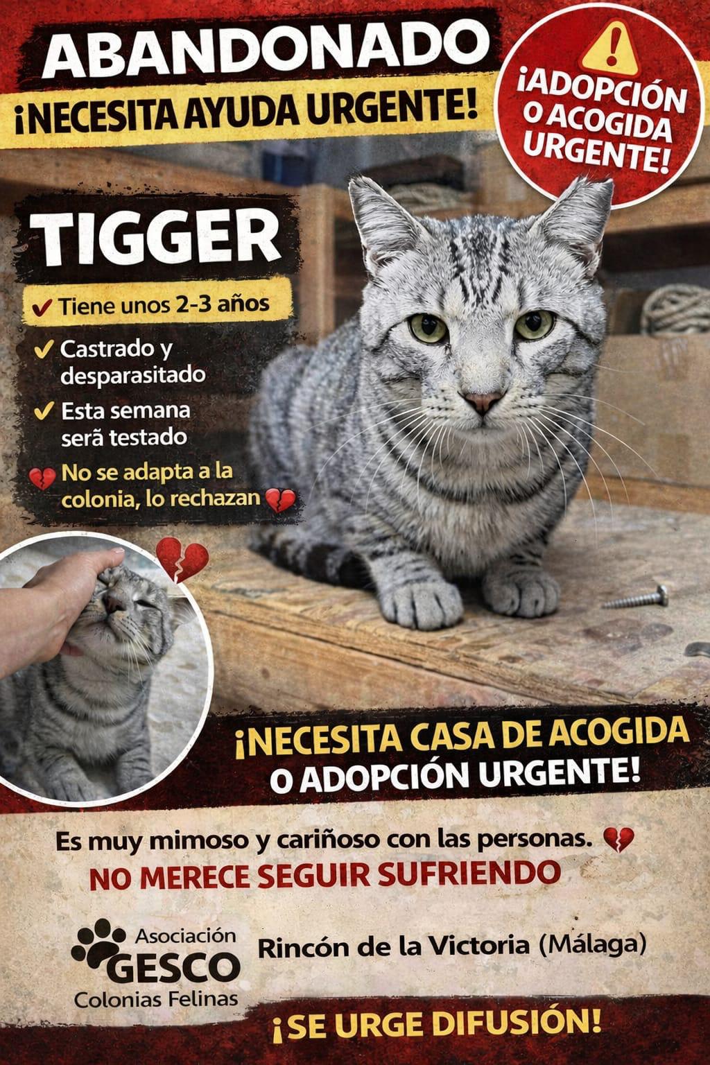--- FOR ENGLISH SCROLL DOWN --- 🚨 TIGGER NECESITA AYUDA URGENTE 🚨 Tigger es un gato de apenas 2-3 años, que ha sido abandonado y ahora mismo lo está pasando realmente mal 💔 ✔️ Está castrado y desparasitado ❌ No se adapta a la colonia, otros gatos lo rechazan Es un gato extremadamente cariñoso, sociable y mimoso con las personas. Solo quiere estar cerca, recibir cariño y sentirse seguro 🐾 Ahora mismo está en una situación muy complicada… no entiende lo que le está pasando y no merece seguir sufriendo 😢 🏡 BUSCA URGENTE CASA DE ACOGIDA O ADOPCIÓN 📍 Rincón de la Victoria (Málaga) 🙏 Necesitamos difusión para que alguien le dé la oportunidad que tanto necesita Si puedes ayudar (acoger, adoptar o difundir), por favor contacta con nosotros ❤️ Entre todos podemos cambiar su destino --- ENGLISH --- 🚨 TIGGER NEEDS URGENT HELP 🚨 Tigger is a young cat, around 2–3 years old, who has been abandoned and is currently going through a very difficult time 💔 ✔️ Neutered and dewormed ❌ Does not adapt to the colony, other cats reject him He is an extremely affectionate, friendly and loving cat with people. All he wants is to be close, feel safe and receive love 🐾 Right now he is in a very tough situation… he doesn’t understand what’s happening to him and he doesn’t deserve to keep suffering 😢 🏡 URGENT FOSTER OR ADOPTION NEEDED 📍 Rincón de la Victoria (Málaga, Spain) 🙏 Please help us spread the word so someone can give him the chance he desperately needs If you can help (foster, adopt or share), please contact us ❤️ Together we can change his life