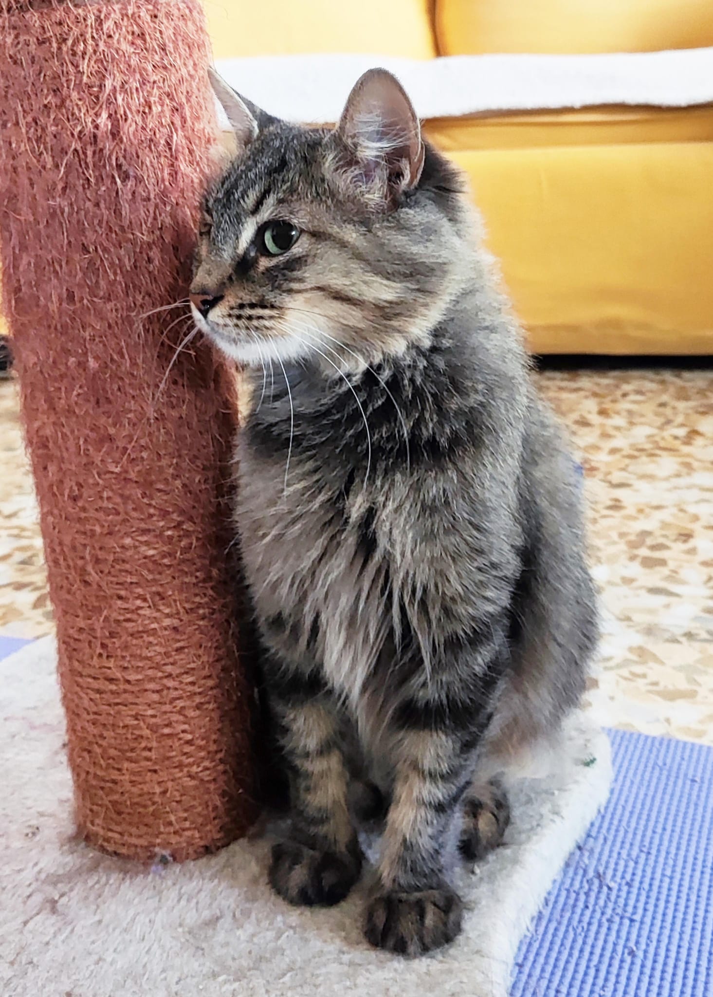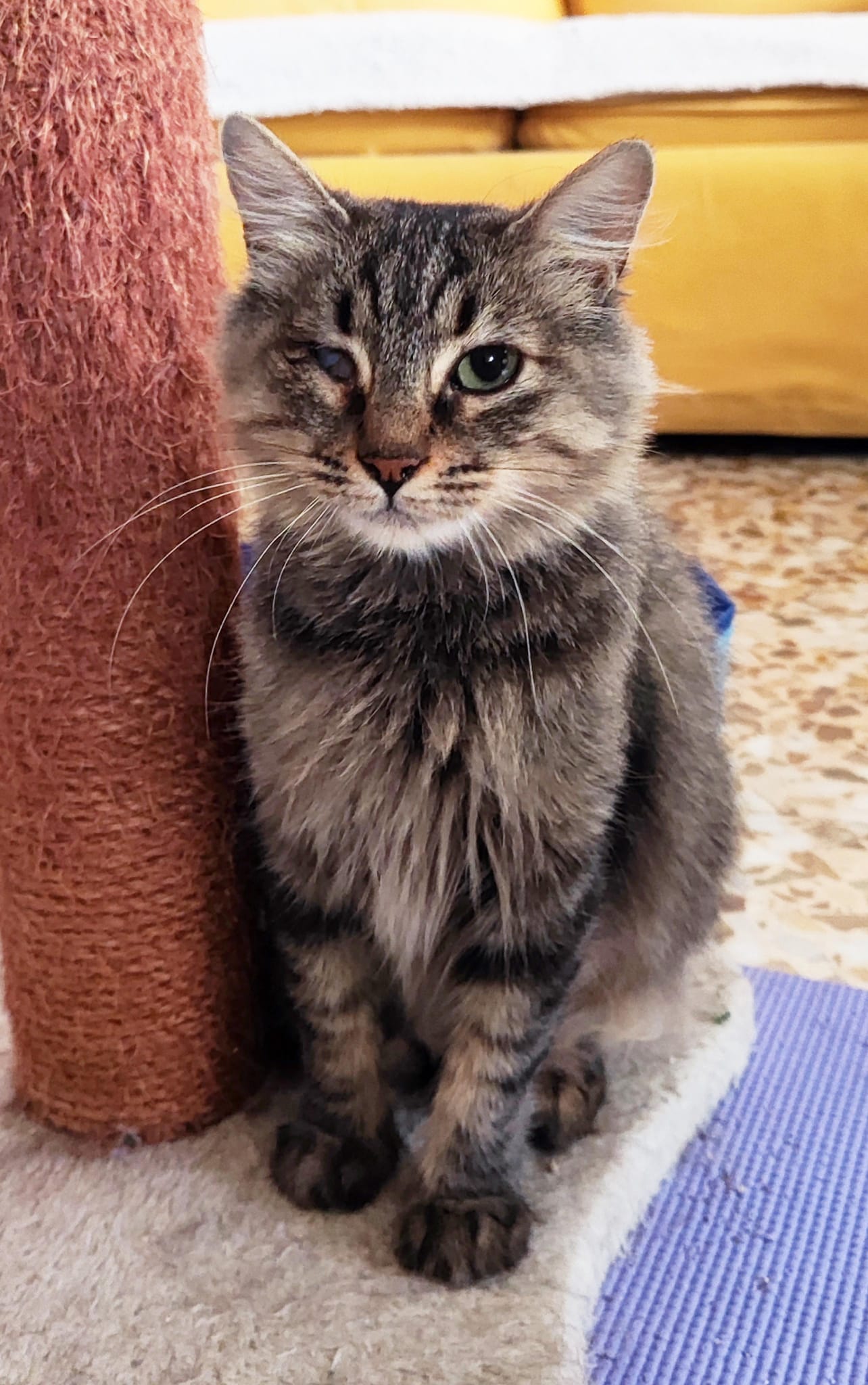 Gata atigrada, con un ojo mal, pero no necesita interveción. Muy cariñosa y sociable. Solo apta para personas que quieran muchos mimos