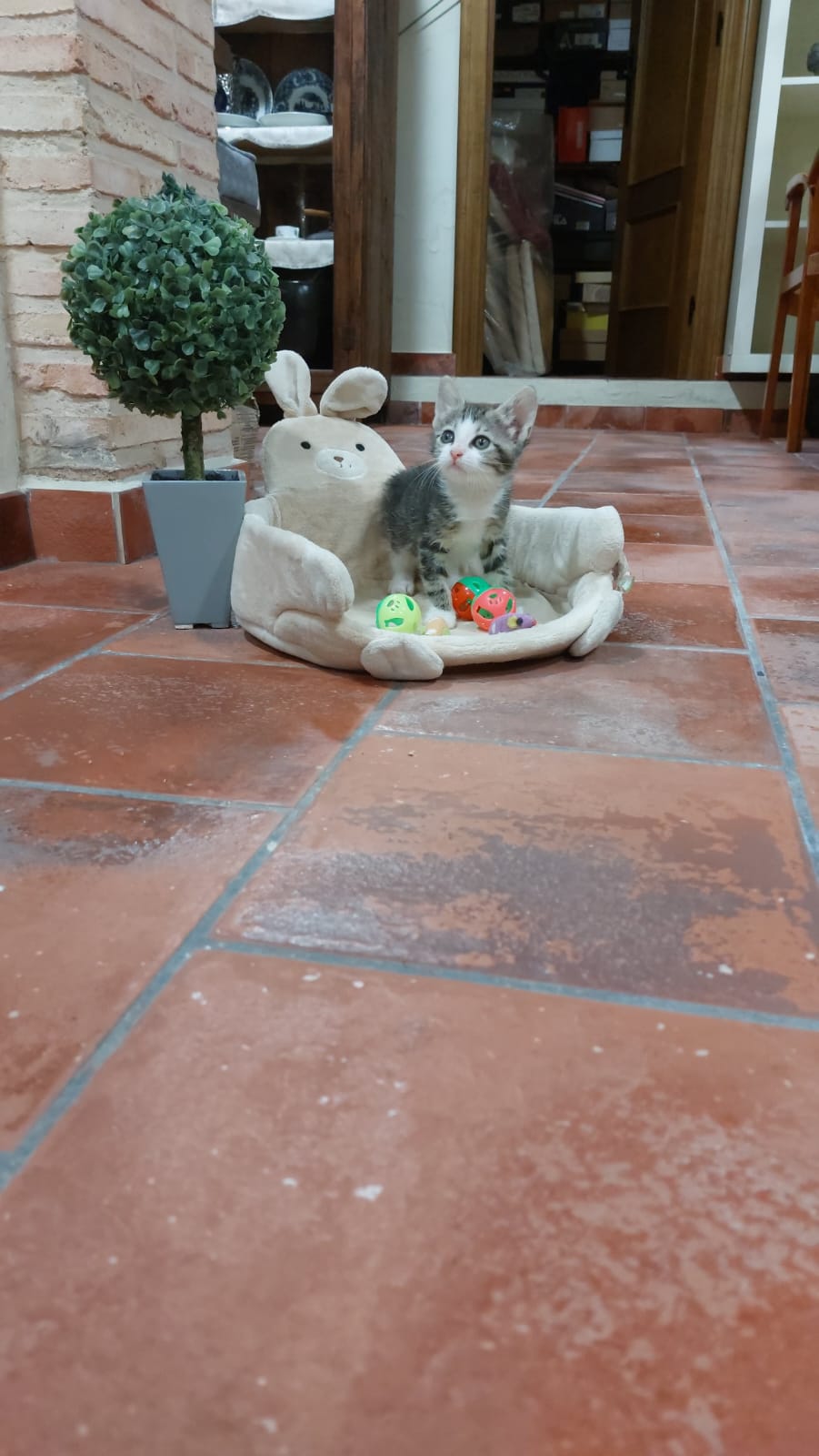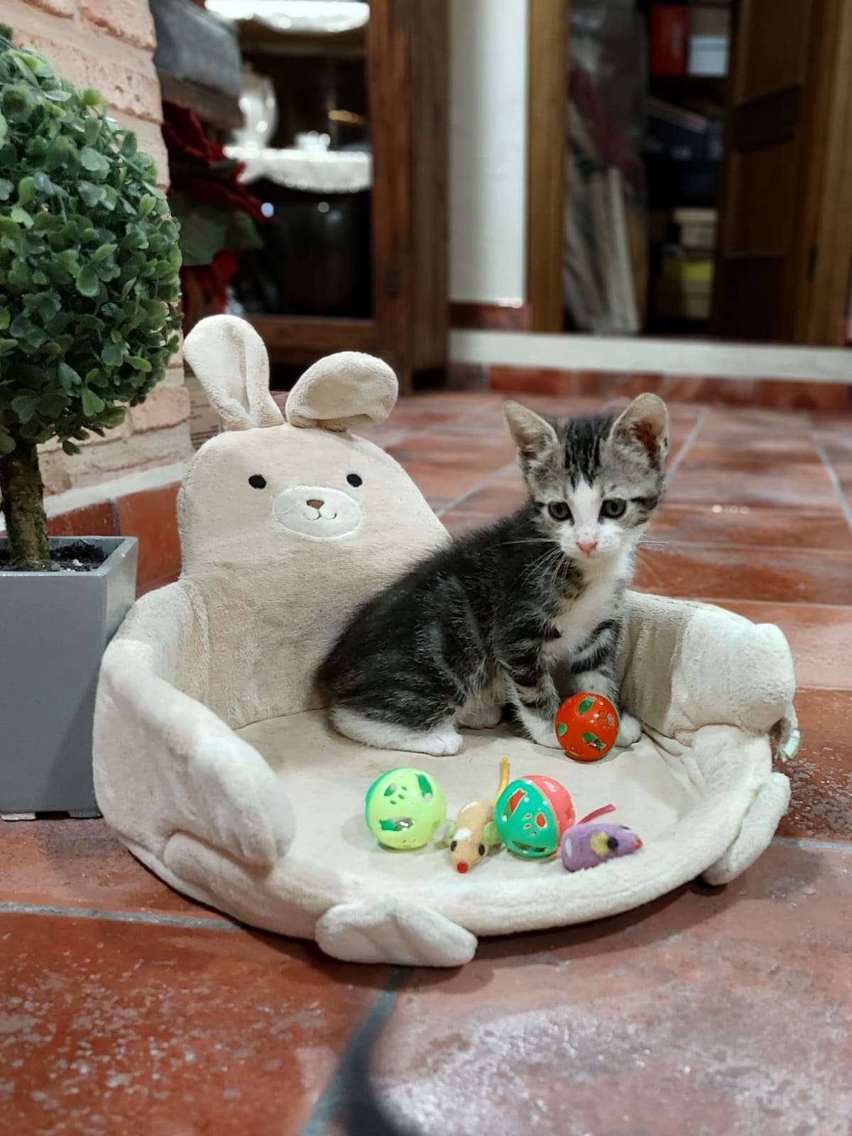 Gatita de dos meses, muy cariñosa y mimosa. Le gusta la compañía de las personas y, al igual que su hermana, ronronea feliz con las caricias. Le encanta jugar.
