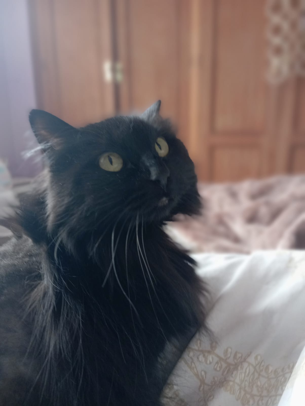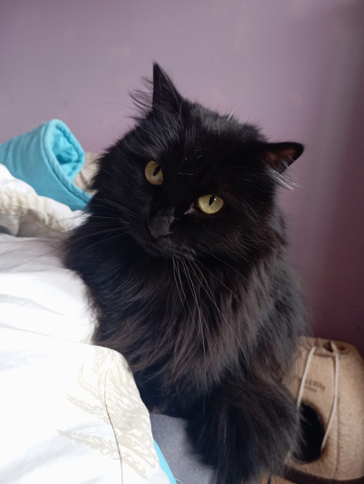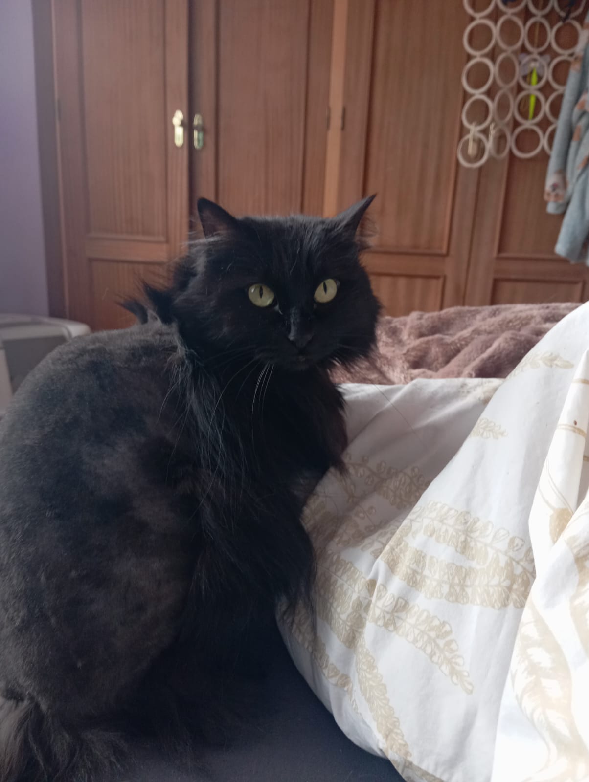 Buenísima gata negra de pelo largo, con preciosos ojos verdes. Es apta con personas y animales, ya que tiene un carácter súper bueno