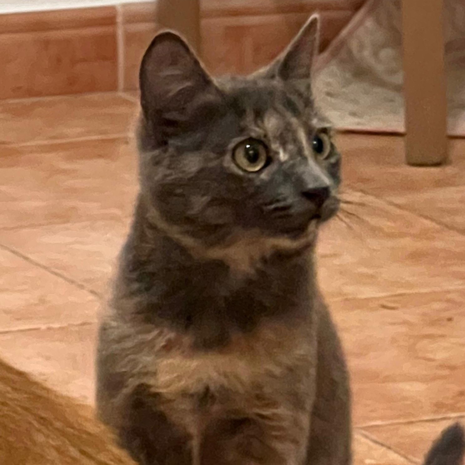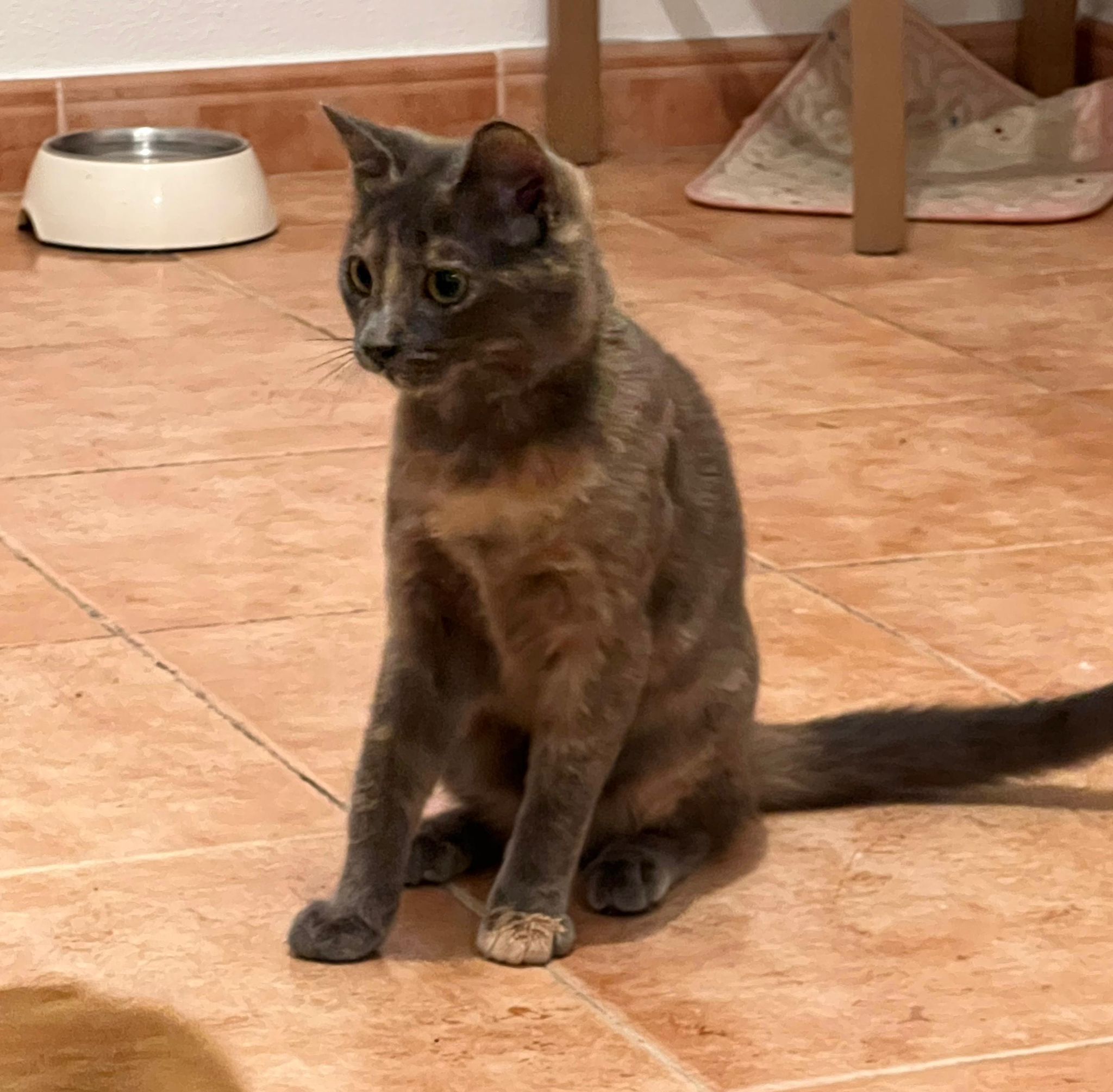Es un poco tímidilla pero un amor cuando tiene confianza. Tiene que irse a una casa donde haya gato o irse con su hermano Popeye porque necesita de otro gato para ser feliz