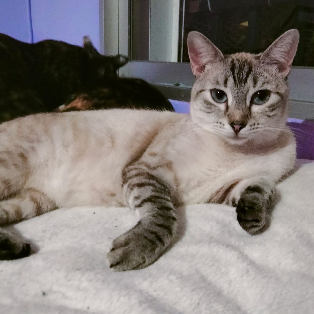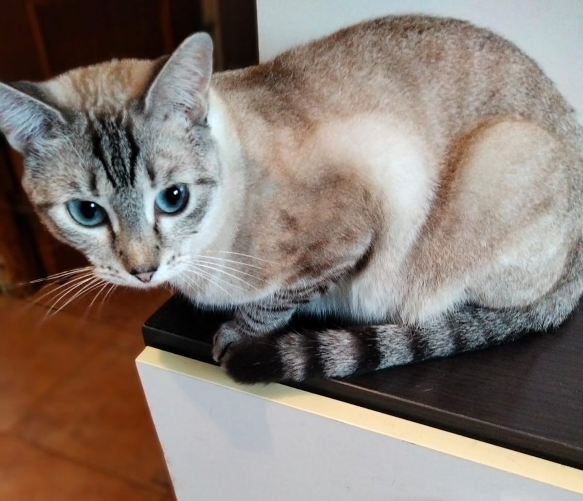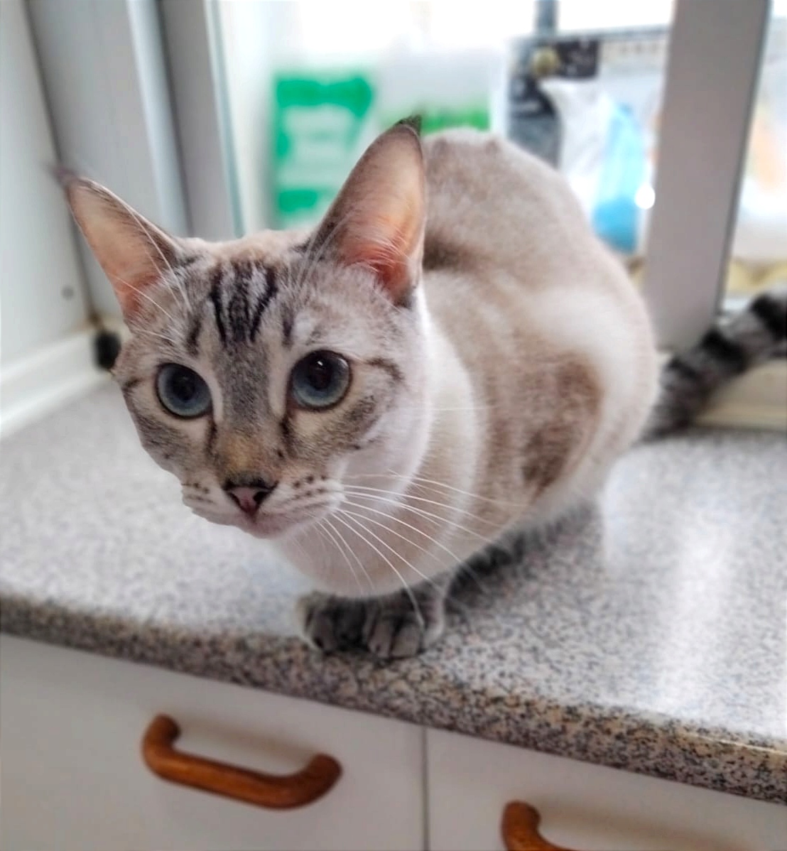 Queen es una preciosa gatita de ojos azules. Es un poco tímida con desconocidos.