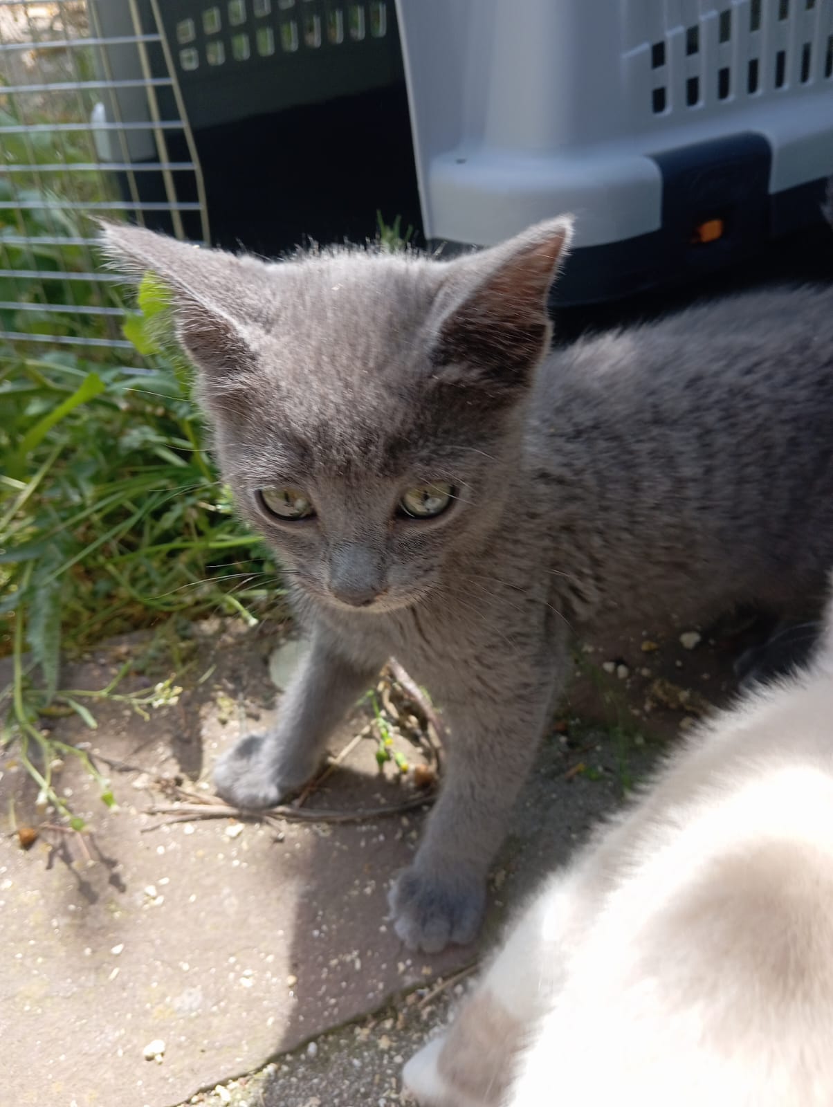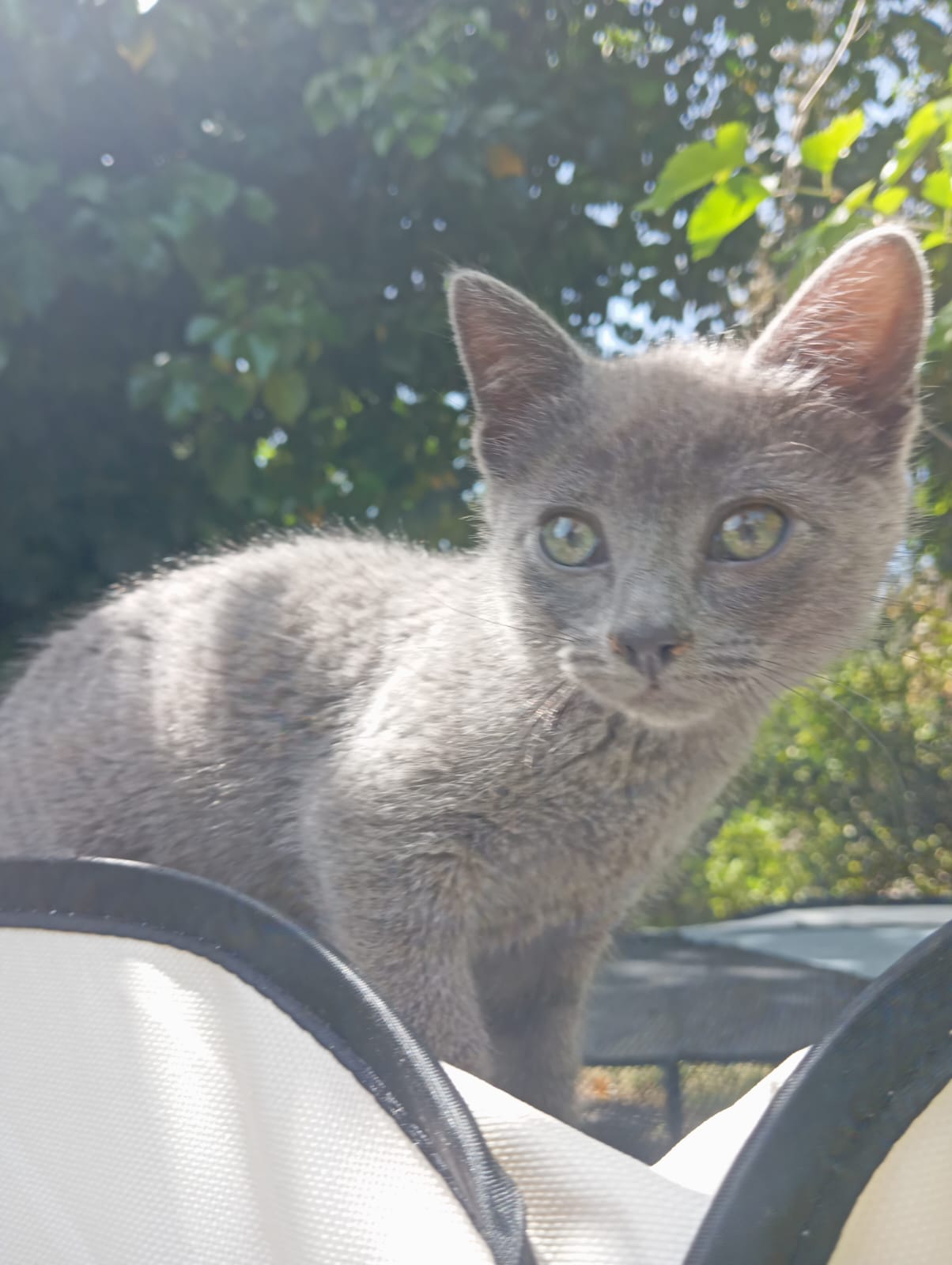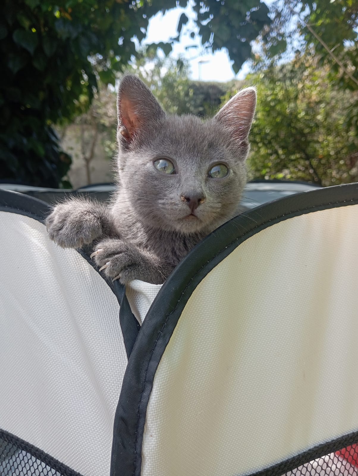 Preciosa gata gris, saladísima y simpática, cariñosa y a la que le gusta explorar y curiosear todo junto con los otros bebés que tenemos.