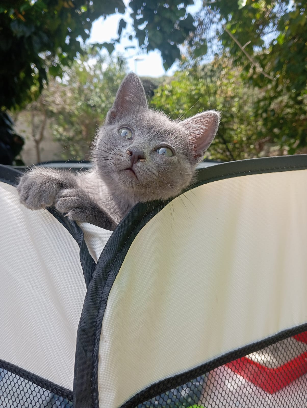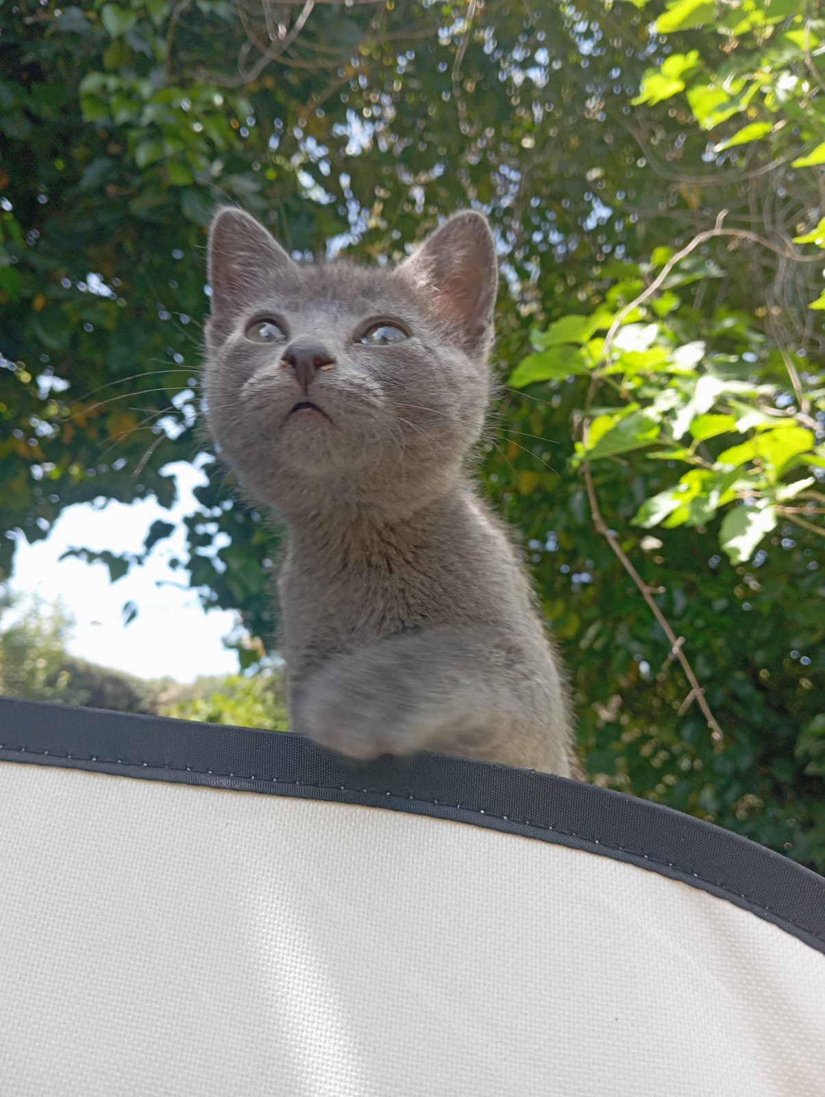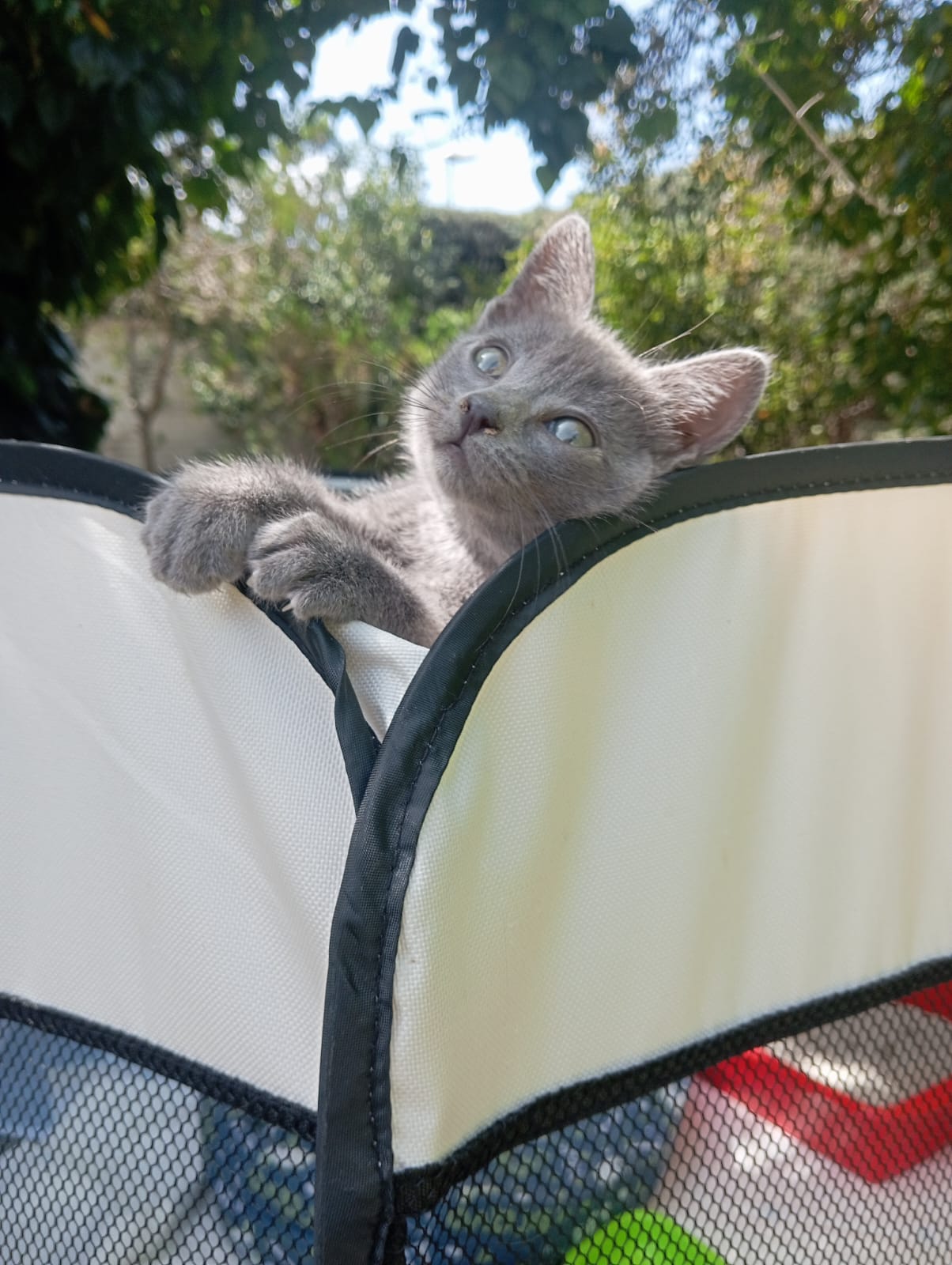 Preciosa gata gris, saladísima y simpática, cariñosa y a la que le gusta explorar y curiosear todo junto con los otros bebés que tenemos.
