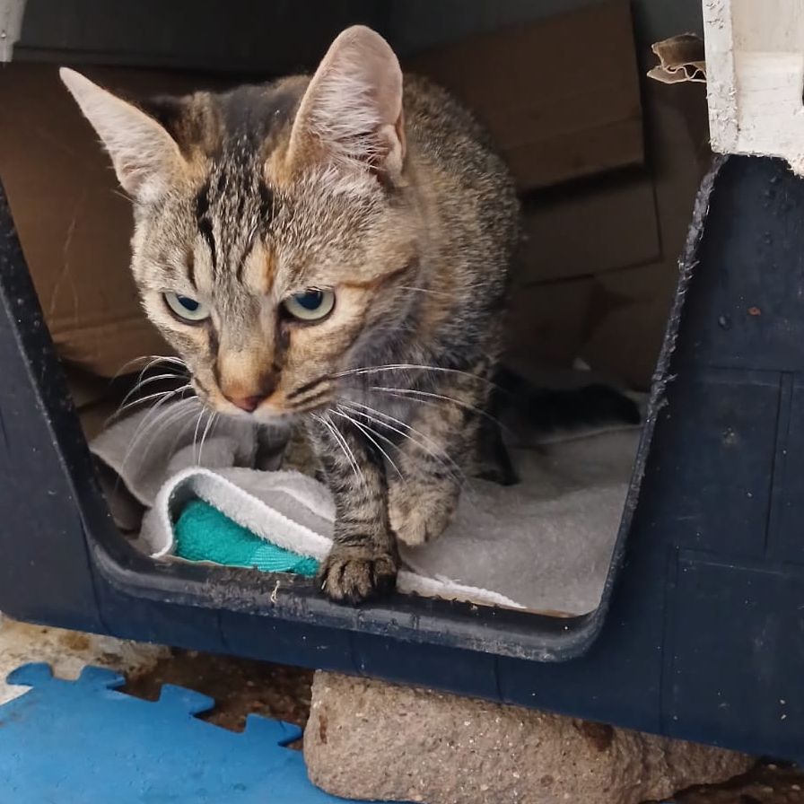Suka se encuentra en un Refugio adaptado solo para perros, en la parcela de al lado hay un grupo de gatos abandonados y allí ha nacido ella. Es cariñosa y necesita urgente salir de esa jaula que aunque la hemos cerrado los huecos como hemos podido no deja de ser un peligro albergar gatos ahí.